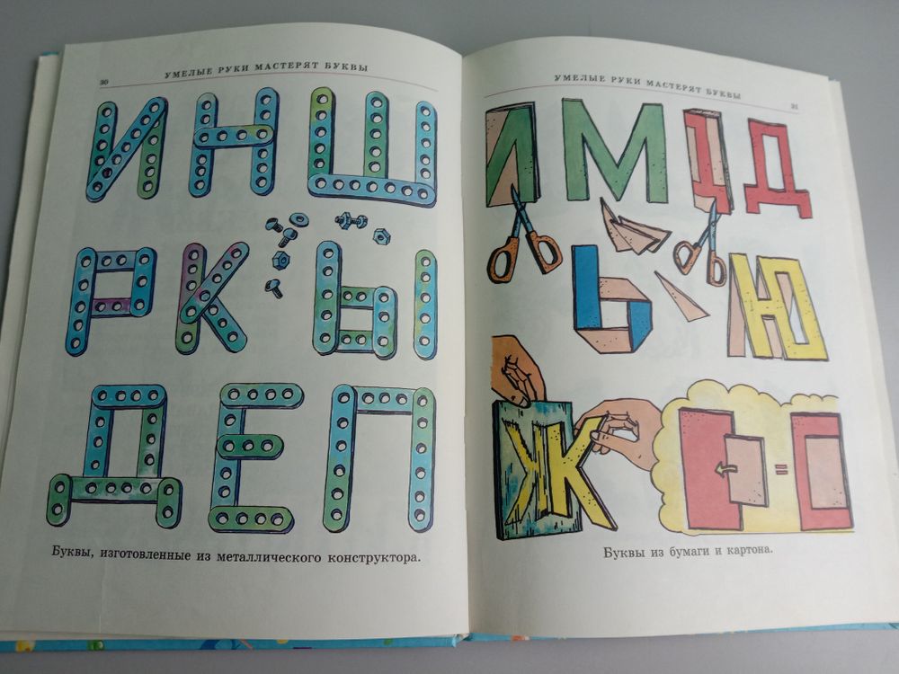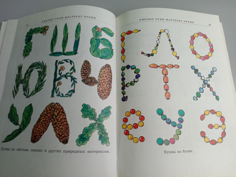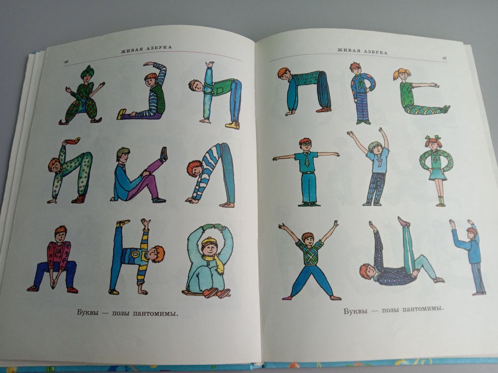 Внутри всякие буквы в разном исполнении (в виде поделок, из пальцев, из собственного тела)