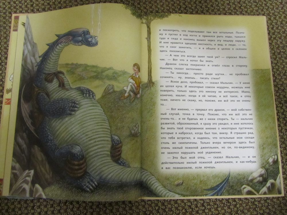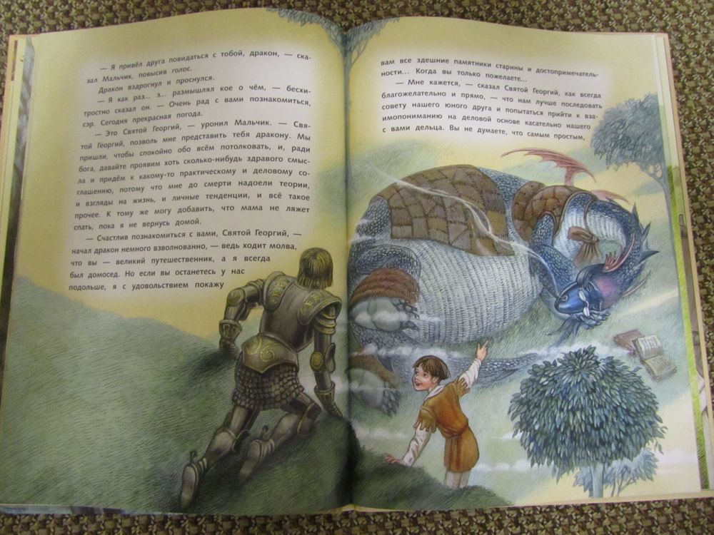 Я просто обожаю Максима Митрофанова, а когда увидела эту книгу на скидках, не смогла пройти мимо)) А сын мой любит книги про драконов, в общем в целом книга пришлась нам по душе, но Грэм это же автор знаменитого романа Ветер в ивах, который многие отмечают как немного занудный, потому что там много описательного повествования, так вот в этой книге автор в своем так сказать репертуаре, нет книга не занудная, но сложная например для шестилетки, сказка получилась немного философской, тема святого Георга победившего змея показана здесь с оригинальной стороны. Но тем не менее книгой остались довольны