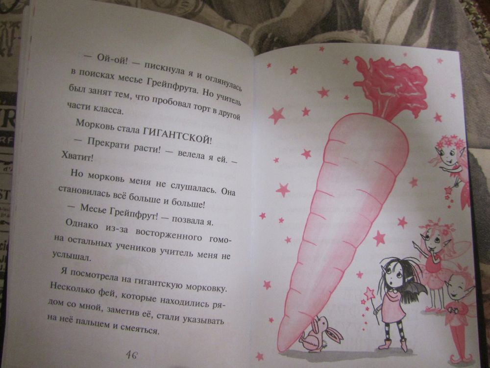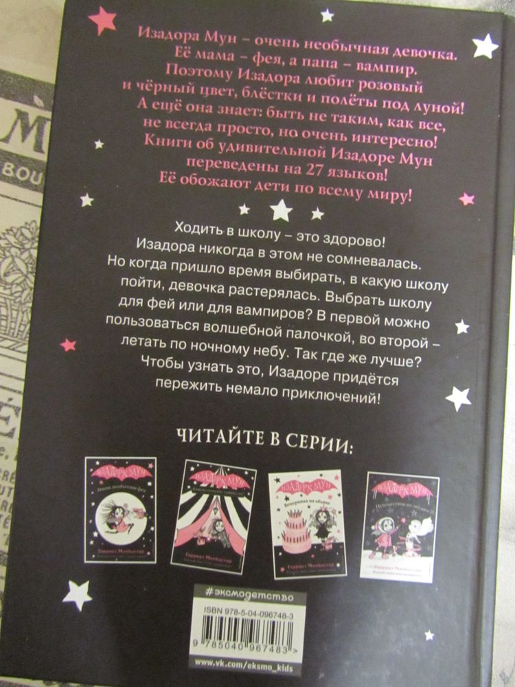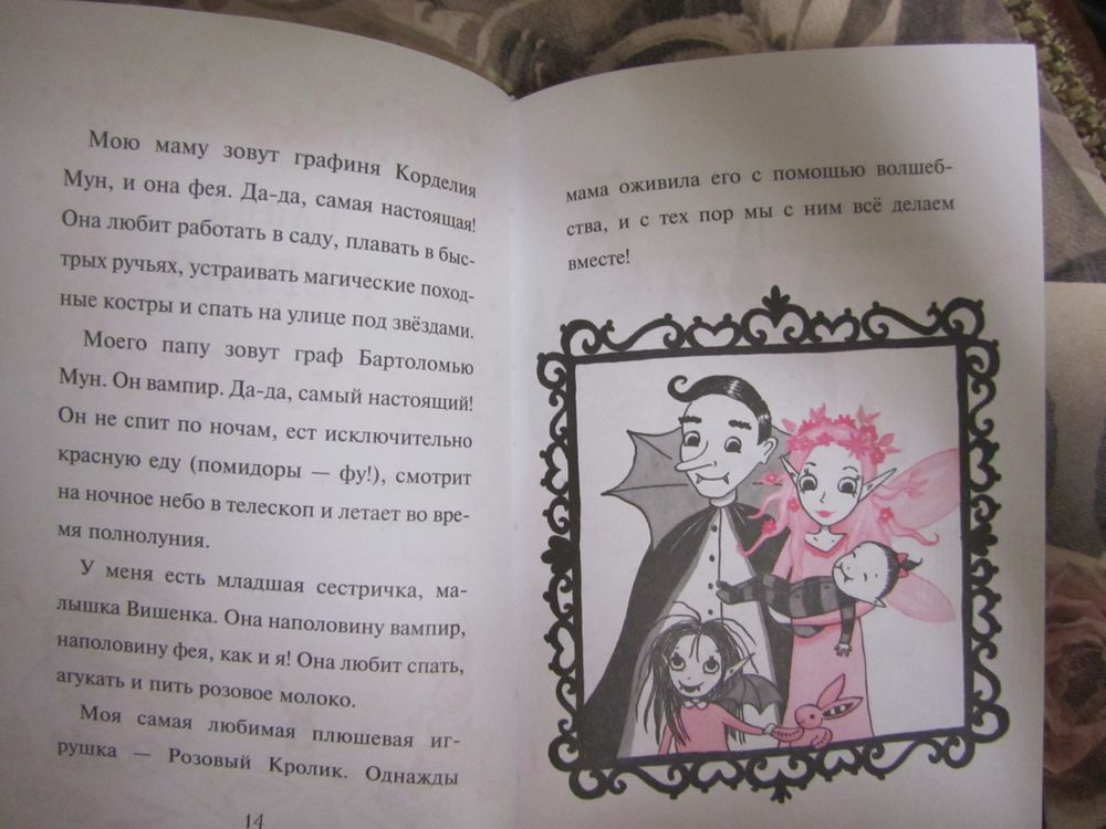 Моя девятилетняя дочь практически не читает, хотя надо сказать и график будничный у неё загруженный, уроки, школа искусств и школа актерского мастерства занимают большую часть времени, однако всё же хочется, чтобы хотя бы чуть чуть , но читала. Показала ей эту книжечку , она загорелась...и прочитала её на одном дыхании. Вообще мне кажется эта серия книг скорее на возраст 7 лет больше подойдет, но для нечитаек тоже оказывается)) История про девочку , у которой папа вампир, мама фея, а девочка сама вообще хочет быть как люди и ходить в обычную человеческую школу. Ну, что скажешь, тема конечно привлекательная сейчас для детей, дочке понравилась книга, но стоит ли мне покупать продолжение я не знаю, не вижу в книге ничего высокохудожественного, а только ради того чтобы читала, не знаю, думаю ещё..А так для привлечения к чтению отличная серия, рекомендую!