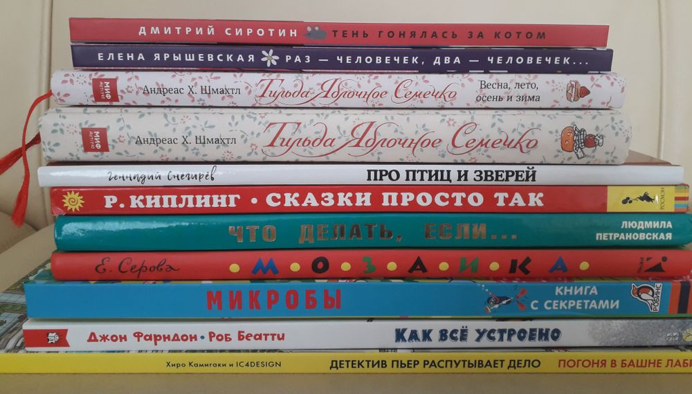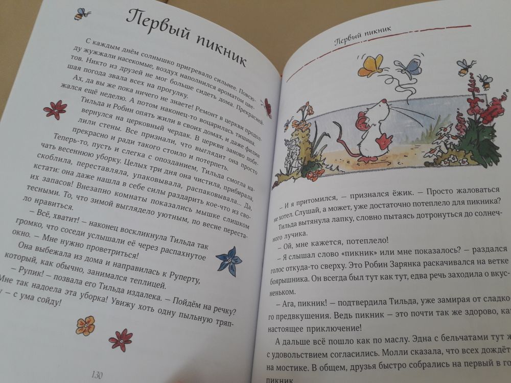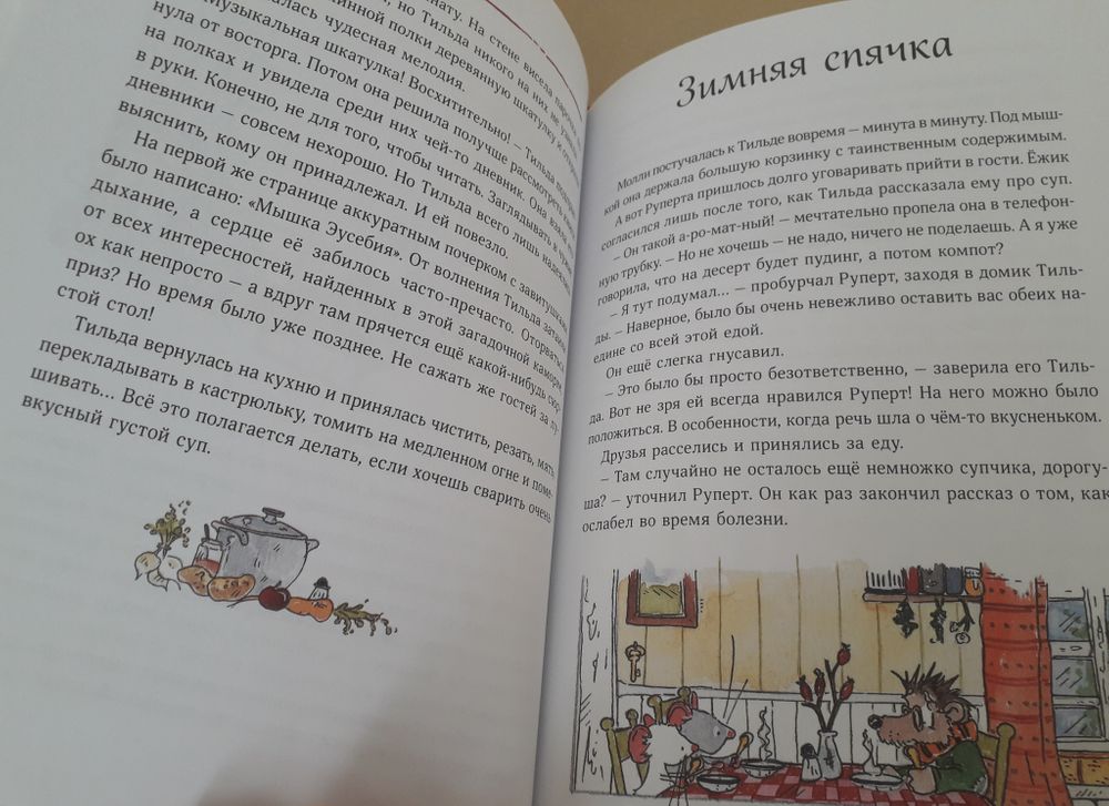 Обе книги мы перечитываем, наверное, раз в третий. Знакомство с этой белой как бузинный цвет по весне церковной мышкой началось у нас с двух книжек-картинок из Фикс прайса, когда Сане было года 3. В книгах рассказывалось, как Тильда помогла появиться на свет утёнку и поддерживала Руперта в неудачливый день. Потом я купила первый сборник...у сына случилась любовь с этими деревенскими зверюшками. Тильда, кстати, навсегда осталась для нас Тильдой Яблочное Сердечко, как она звалась в книжках-картинках. В оригинале она Apfelkern, а Kern-это сердцевина, ядро. "Семечком" сын её не воспринимает :)