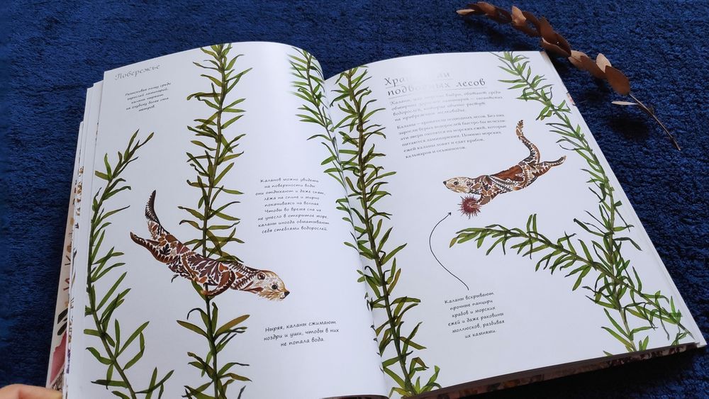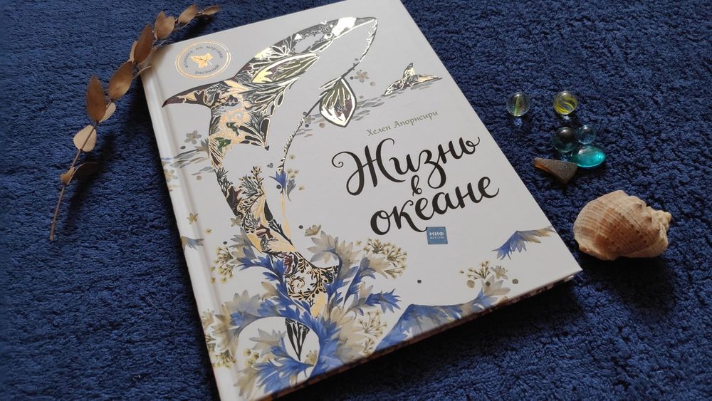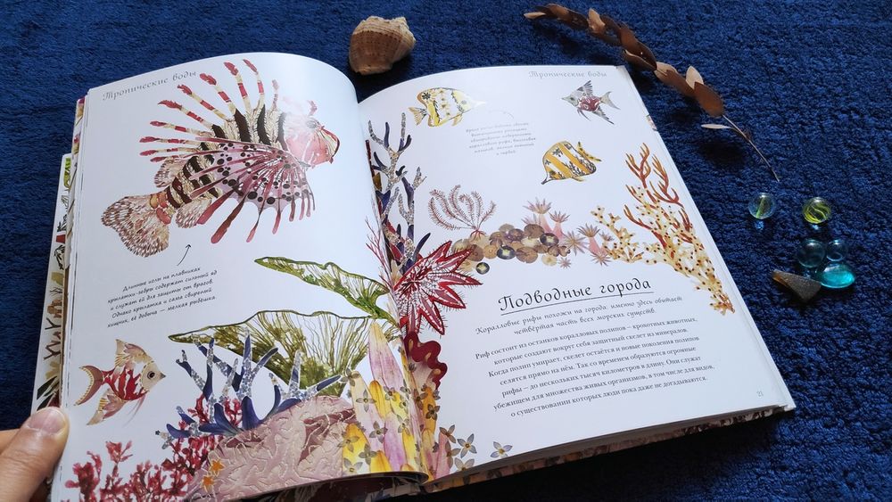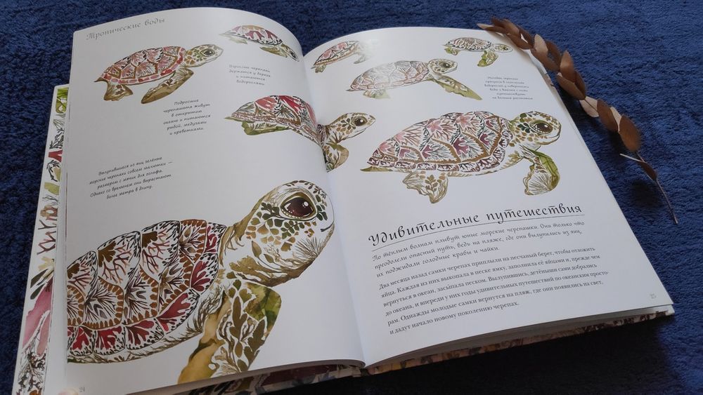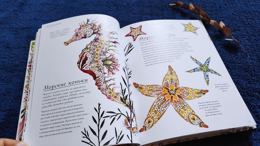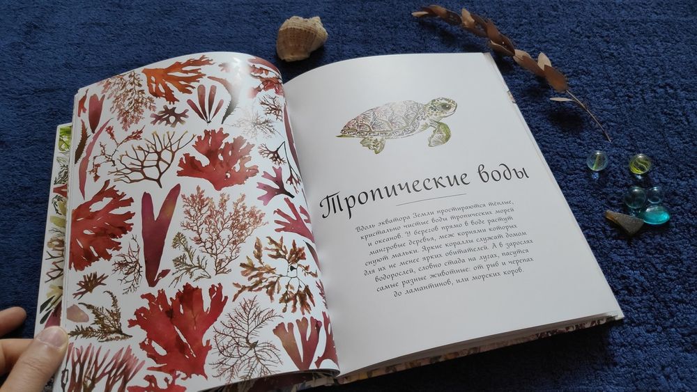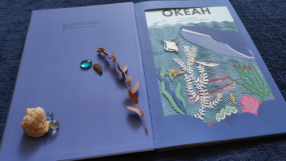 Жизнь в океане - именно книга-украшение в чистом виде. Взята в пару к первой - Год в лесу, после осенних медитаций-релаксаций над ее страницами. Кстати, собранная осенью под впечатлением от книги трава разной степени мохнатости так и прессуется в газетах под книжными стопками. Можно отложить в сторону мысли о картинах с травяными зайцами и цаплями и начать мечтать о черепахах с акулами. Сена на всех хватит, однозначно. Куда хуже обстоят дела с временем и терпением...