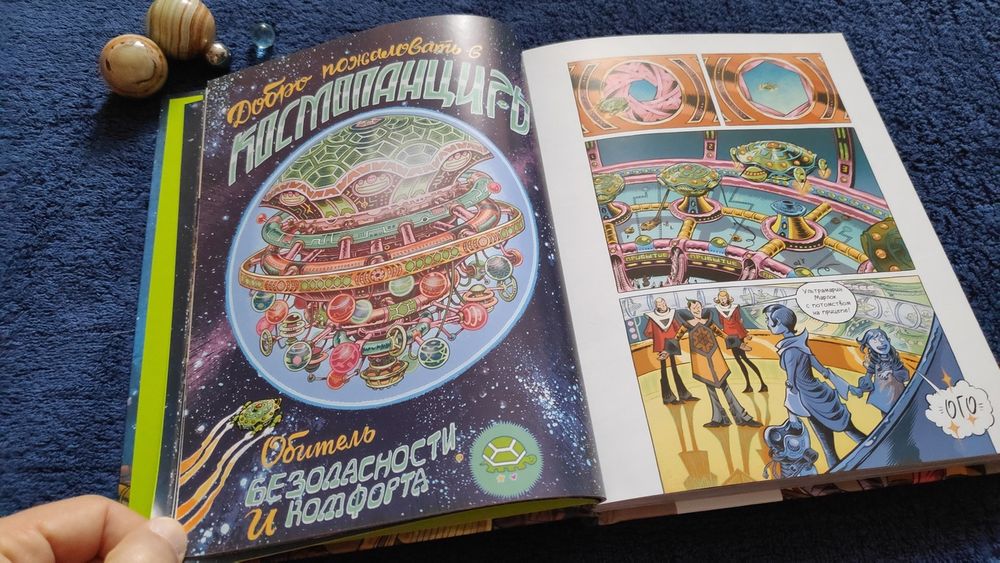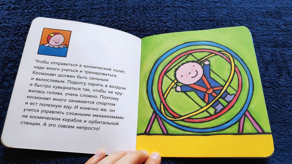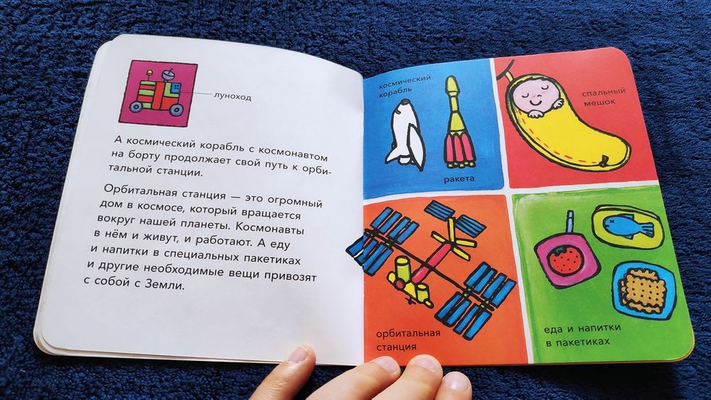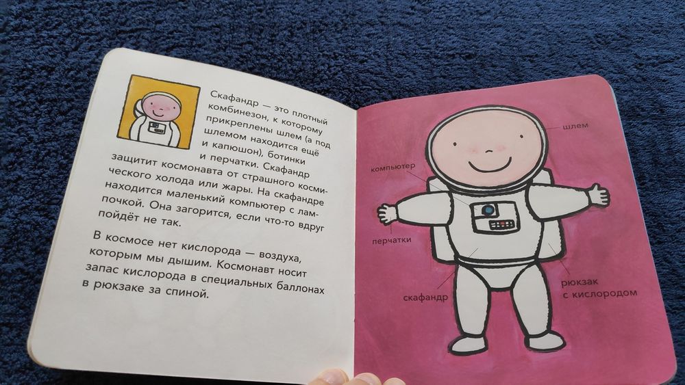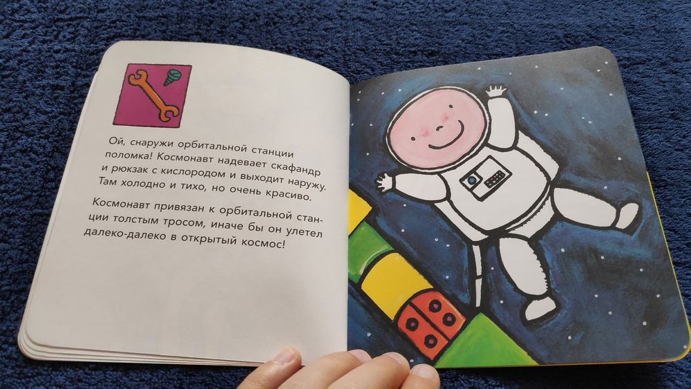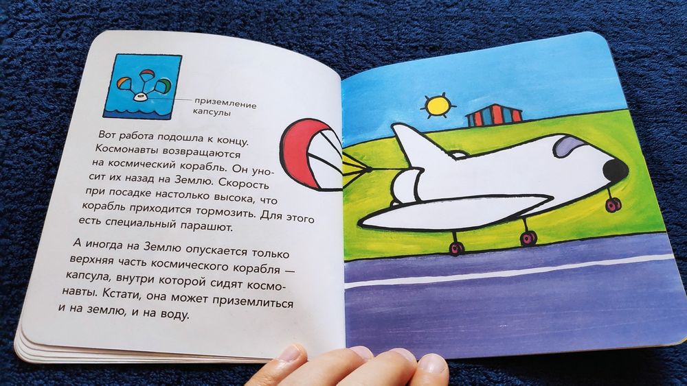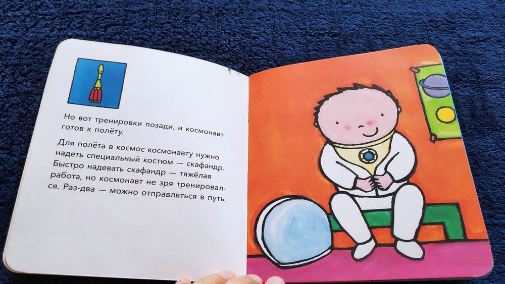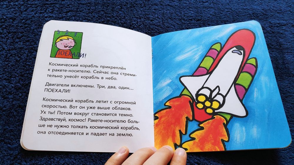 В ней один связный последовательный рассказ, который вмещает в себя все - и подготовку к полету, и сам полет и пребывание на орбите, и возвращение на Землю. Без заумных подробностей, просто и понятно даже двухлетним малышам.