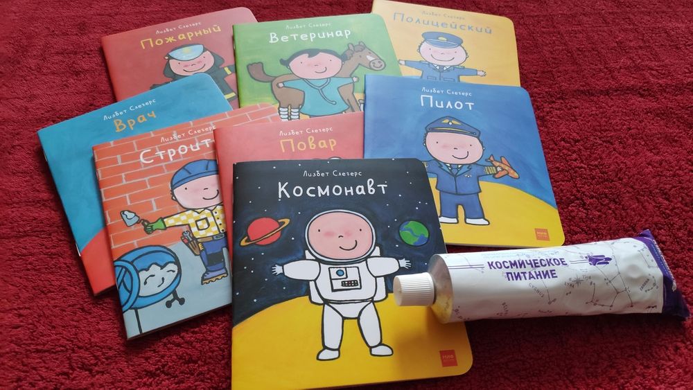 Набор книжечек не зря называется "Играем в профессии", потому что кувыркаться и стоять на голове, когда это просто бесилово, это одно, а играть в космонавтов - совсем другое! Потому что после кувырканий надо обязательно научиться одеваться (лучше всего на прогулку по Луне) - нижнее белье-колготки/кофты, скафандр-комбинезон,