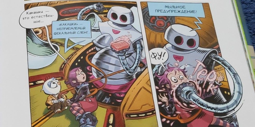 Позабавила личная робонна Элиота, которая, при употреблении недопустимого сленга в третий раз, заклеивает проштрафившемуся рот скотчем )) Тонким этот юмор не назовешь, но детям понятен.