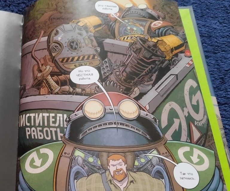 "Авторского" пояснительного текста нет вообще, только реплики героев, но происходящее считывается совершенно без усилий. Очень помогает фон - вывески, надписи, предупреждающие таблички и прочая инфографическая разметка пространства.