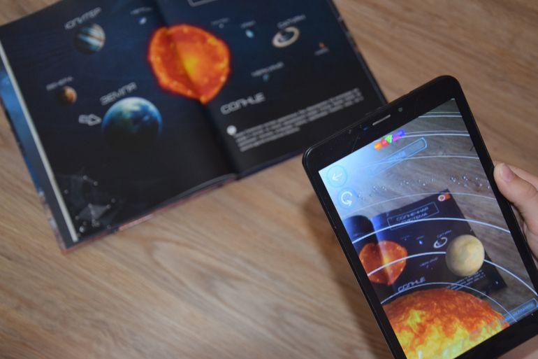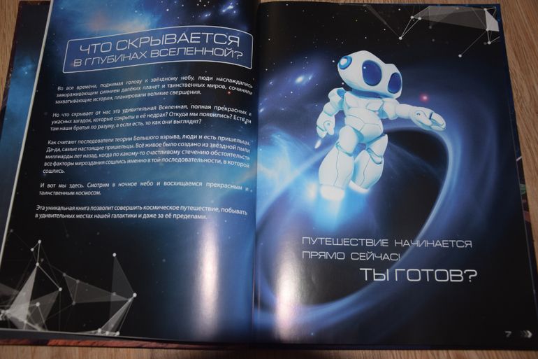 Изучаем трёхмерные космические модели с помощью установленного приложения на планшете. Планеты оживают на страницах книги! На помощь нам приходит робот-помощник. Можно разложить планеты на слои: от внешней оболочки до ядра. Посмотреть, как планеты расположены в Солнечной системе. И даже можно управлять марсоходом. Восхищаемся прекрасным и таинственным космосом!