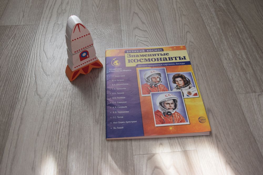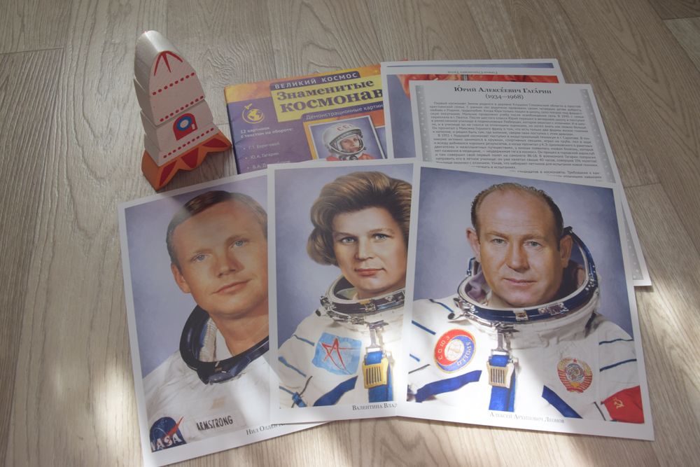 12 картинок с текстом на обороте. Небольшая биография известных космонавтов.