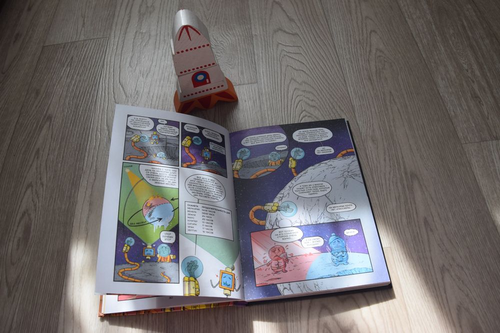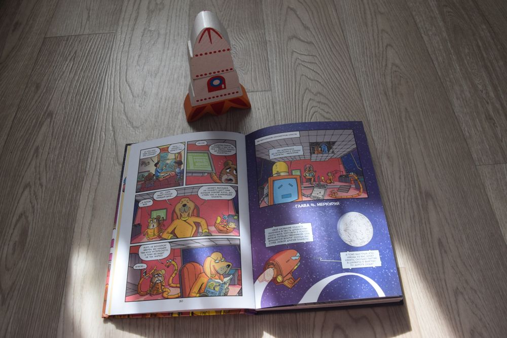 На топливе под названием "тягазнаний" герои комикса - звериный экипаж из собаки Райли, хомяка Фортинбраса, кошки Пепер и змеи мистера Слиза отправляются в увлекательное космическое путешествие. Узнаем о тайнах Солнечной системы. Например, вы знали, что пояс астероидов - это раскинутые на километры друг от друга булыжники в форме пояса? Или что день на Меркурии длится 2 месяца? Интересный, познавательный комикс.