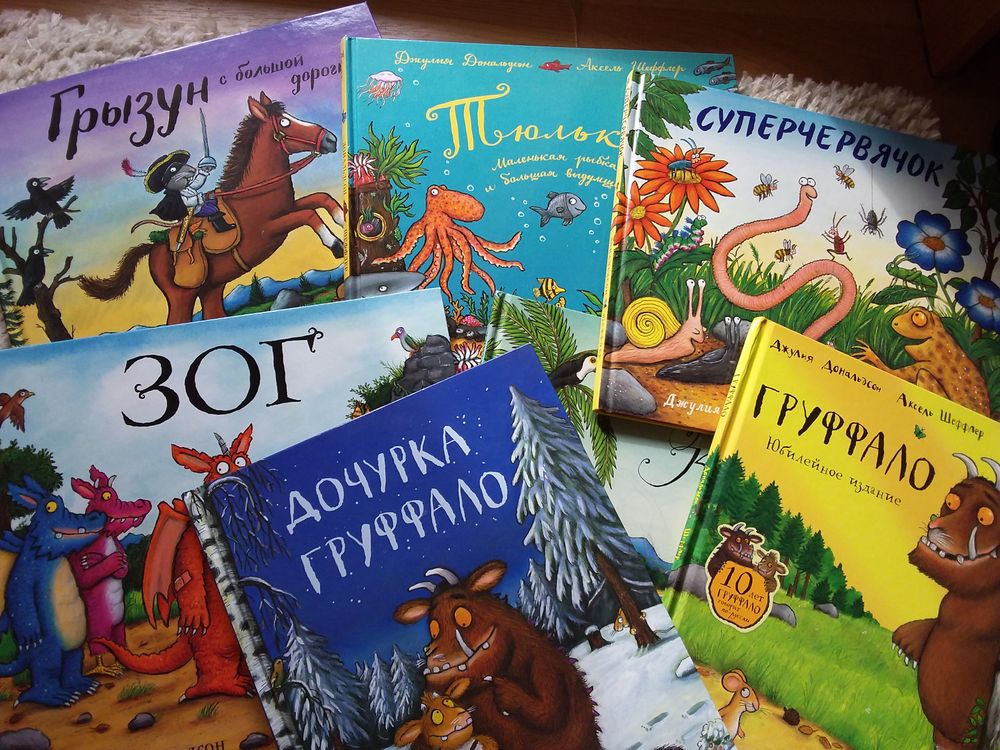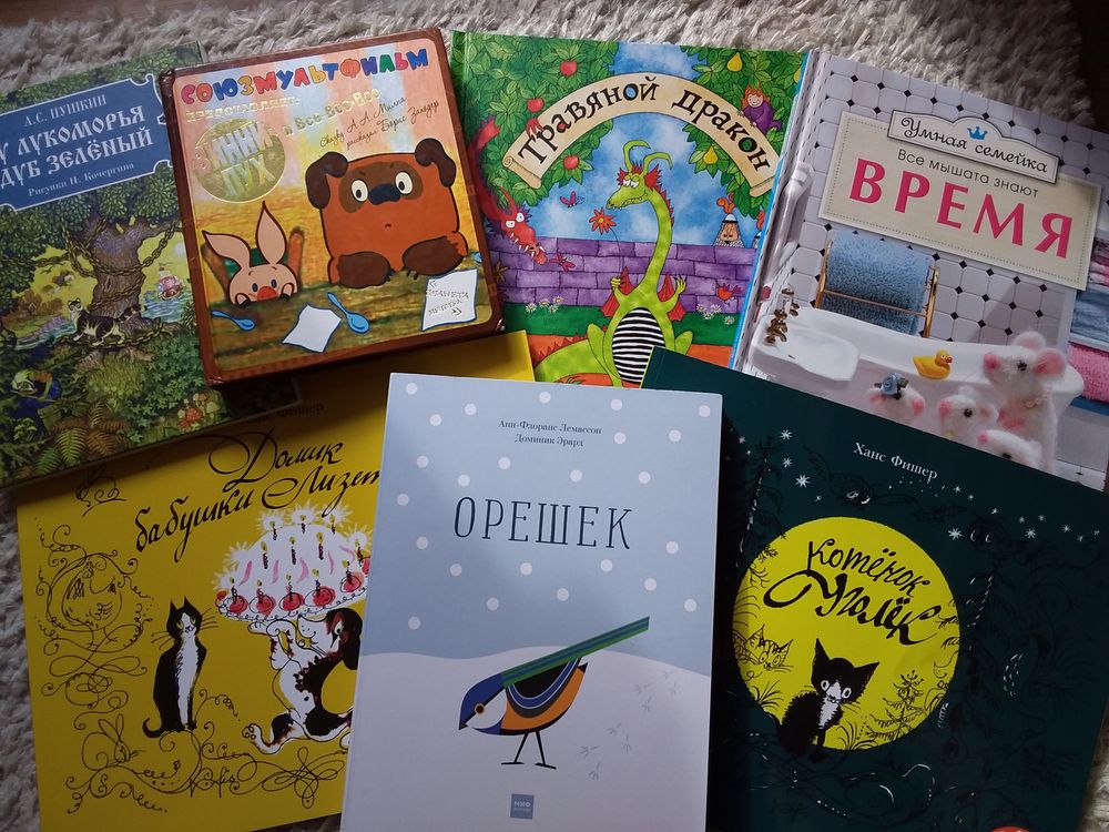Читали в основном книжки-картинки, и тоже всё старенькие - Уголёк, Мимбо-Джимбо, Дональдсон, картонки. Я даже не знаю, что о них рассказать). Все книги, о которых знают все! И многие любят! Если будут вопросы спрашивайте.