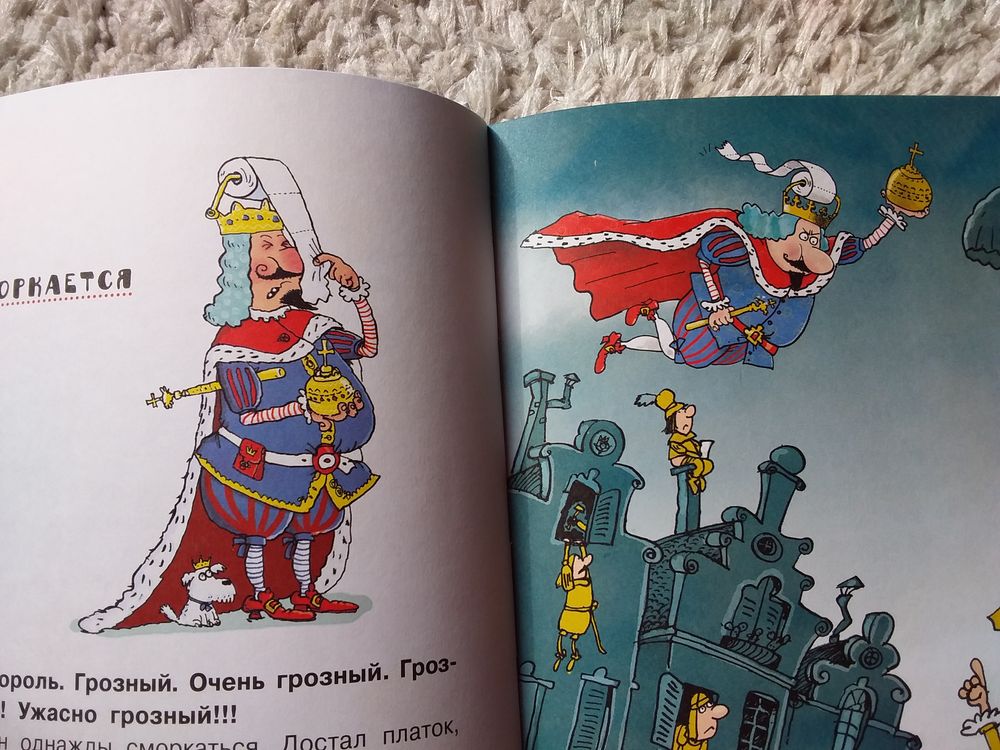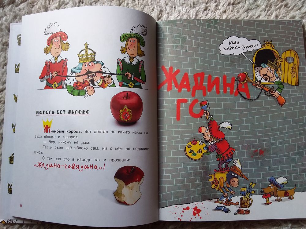 Вот честно, попадись эта книга мне в руки года два назад, она не осталась бы в нашей библиотеке. А теперь мы читали все втроём и хохотали. Про короля юмор на постарше, так что отложила пока. Нам очень многое близко! Частенько жадничаем, и обзываемся жадина-говядина, и сморкаться не любим, а потом как хорошо )), да много всего, о чем не принято говорить. Иллюстрации- отдельная песня. Чего стоит только корона с туалетной бумагой.