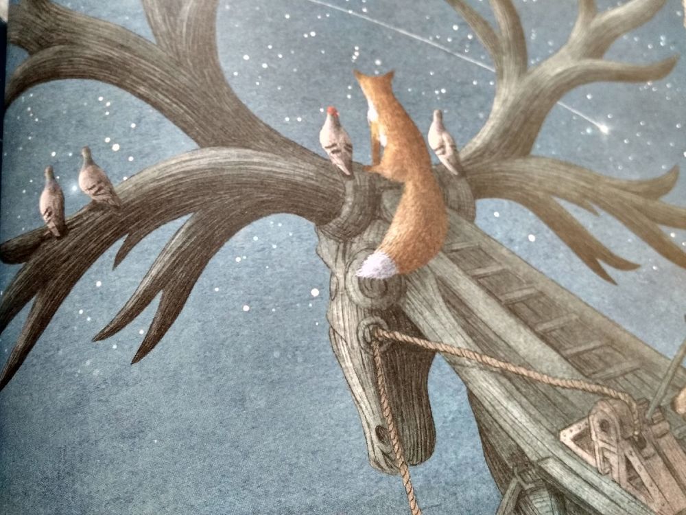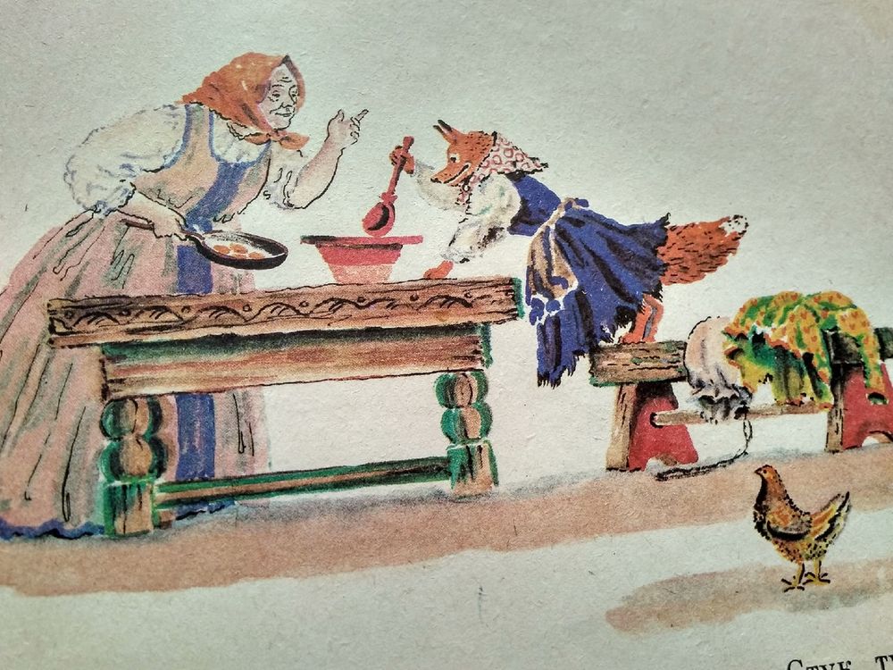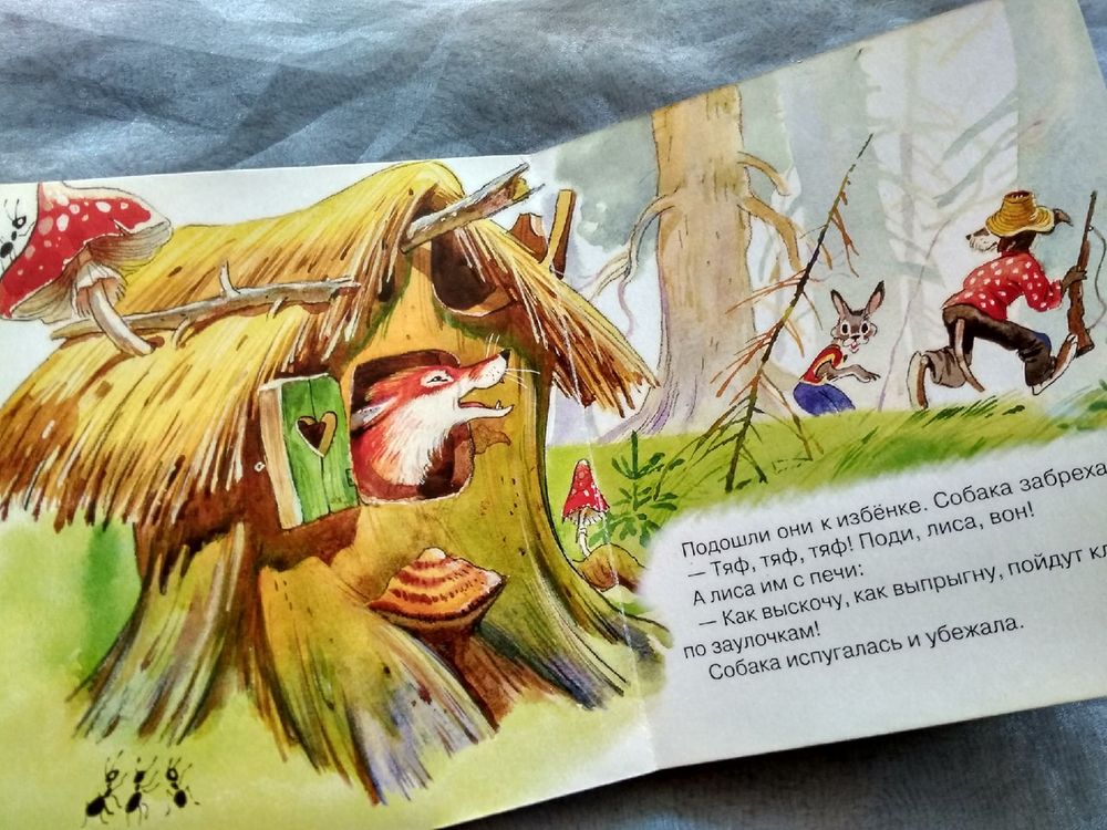 А это у Дугина - все та же бессовестная лиса, которую в этом варианте сказки зарубили косой... И потому картонка спрятана была далеко. А то Даньке все время надо было жестоко наказать злую лису - непременно зарубить. И жаль, что косой, а не мечом...