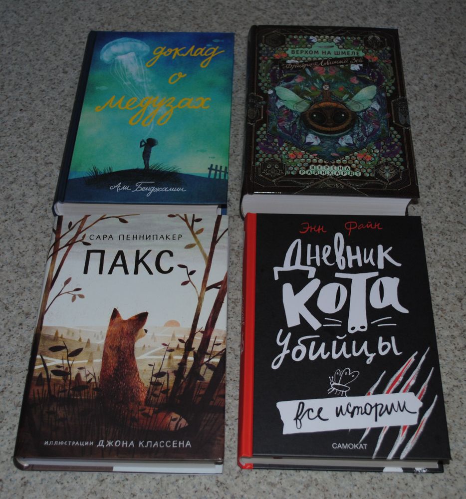 Тёме очень нравятся книги Крюковой про Котосапиенса. В пару к ним взяла "Дневник кота убийцы". Остальное хотела прочесть сама. Но "Шмеля" и "Доклад о медузах" сын в свою стопку положил, думаю, раньше меня доберется.
