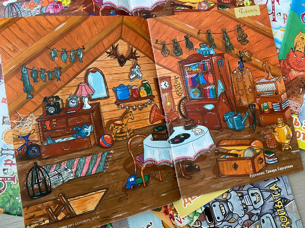 Алёнка, мало интересуясь архитектурой, всегда отмечает архинеобычные выражения Архиляки и способность спать вниз головой и не падать) История чердака разворачивается в весёлых комиксах из номера в номер.