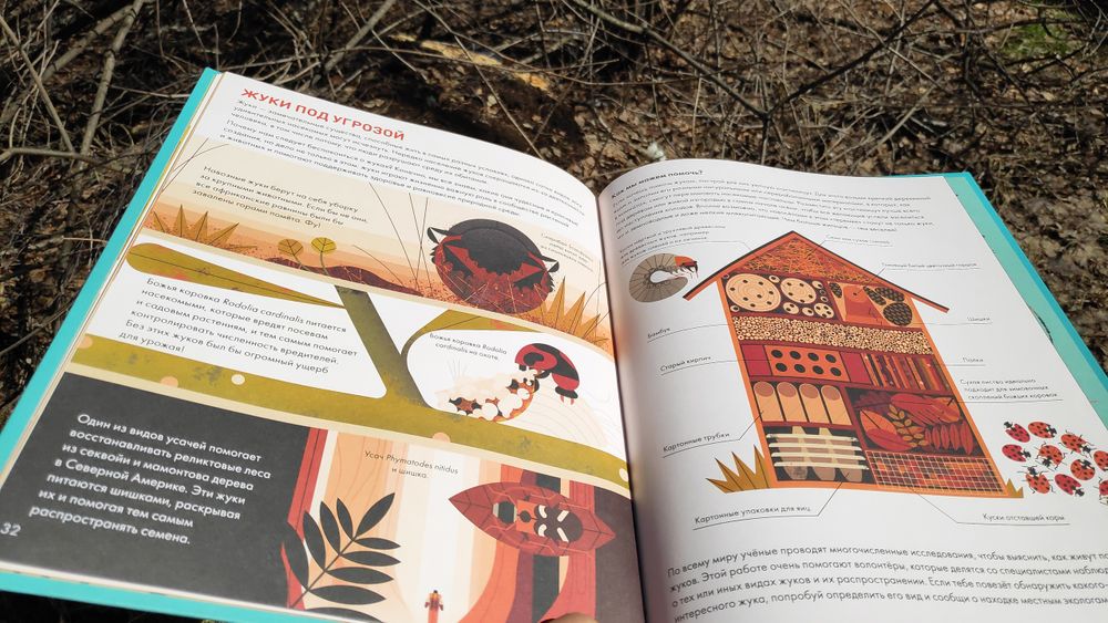 Последний разворот предлагает юным колео-птеро-логам, блин, "юный энтомолог" произносится гораздо легче помочь жукам перезимовать, для чего можно набить скворечник жучиную гостиницу всякой всячиной и поставить под дерево ранней осенью, чтоб квартиранты успели въехать до холодов.