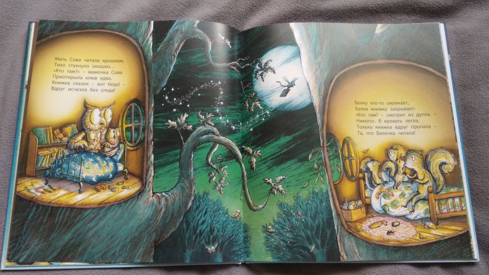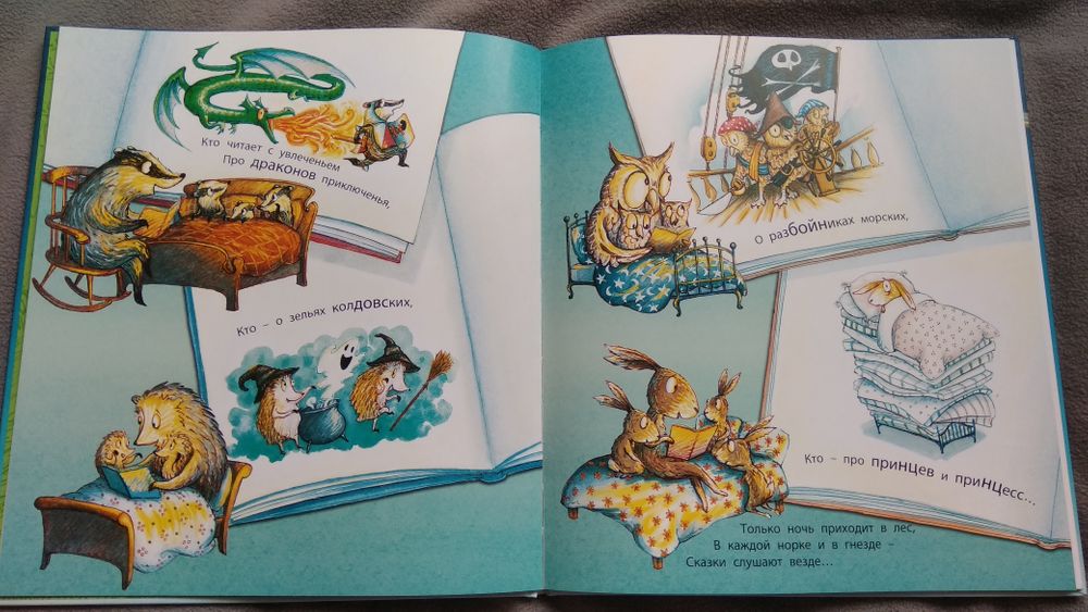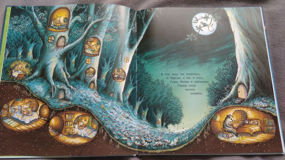 Прекрасная добрая история в стихах, с милыми иллюстрациями. Все можно рассмотреть и кому читают и где кто живёт. чудесная, темный фон ее портит только на фото, в жизни все отлично!