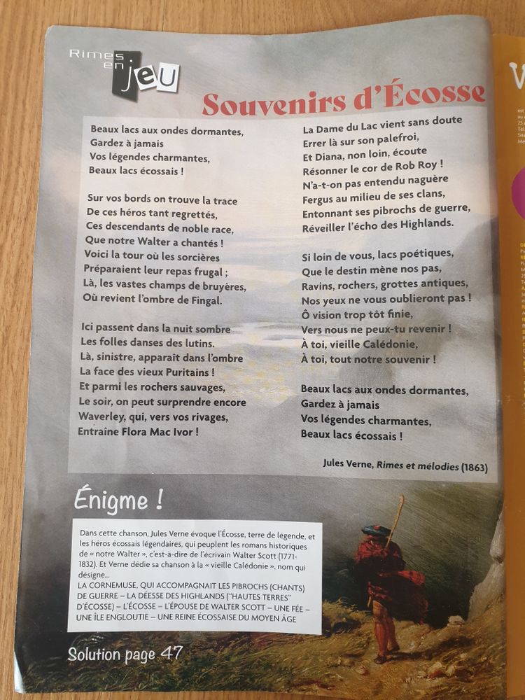 Стихотворение Ж. Верна о Шотландии. Угадать надо, что означает "Старая Каледония" - это выражение встречается в тексте. Я не знала, что так называли Шотландию.