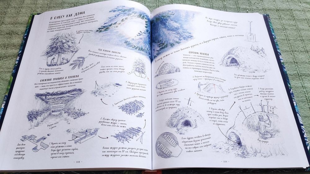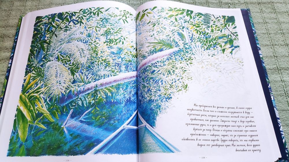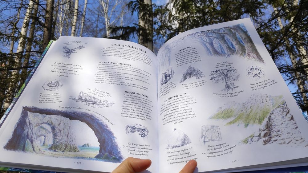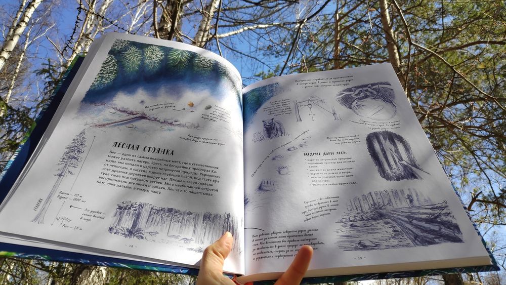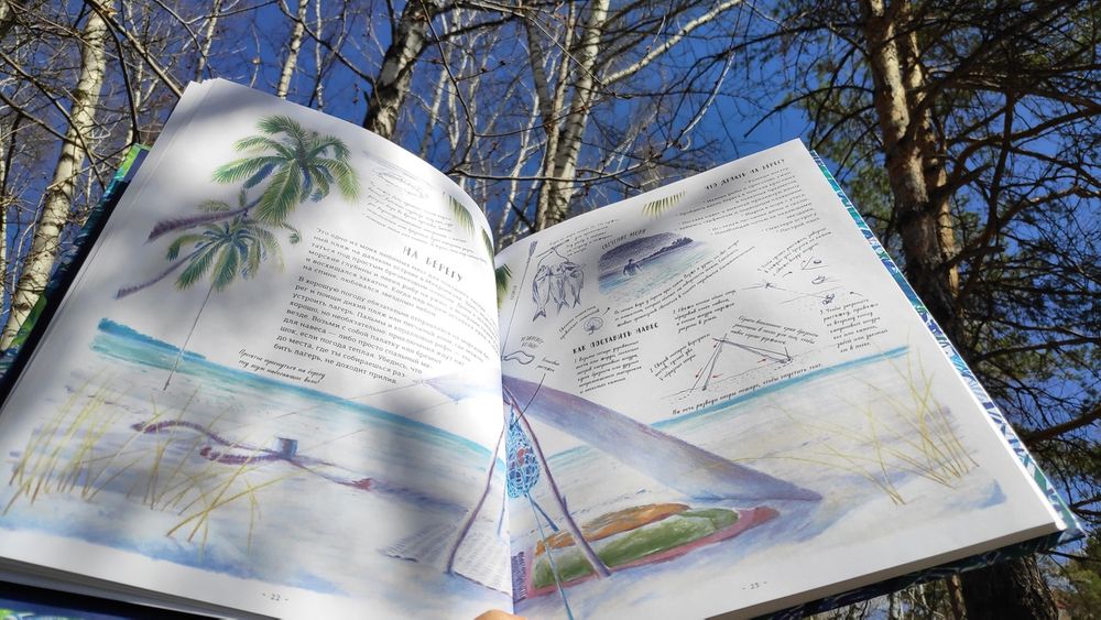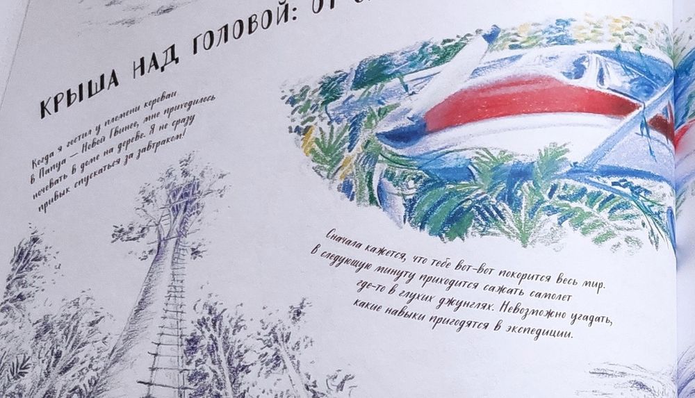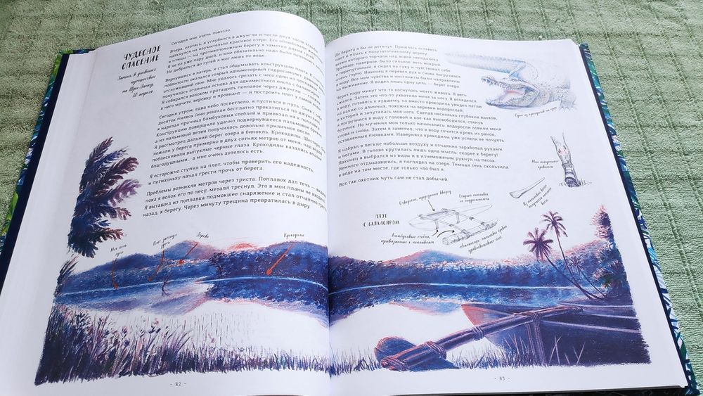 Книга очень красивая! На разворотах множество иллюстраций в такой долгожданной реалистической манере, выполненных в приятной синей цветовой гамме, очень комфортных для восприятия. Часто бывает, что огромное количество рисунков просто свалены в одну кучу и утомляют глаза и мозг, но здесь все продумано, картиночки ведут нас от одной к другой, уточняя и дополняя рассказываемое. Правда места пребывания меняются довольно неожиданно. То тихоокеанский тропический остров, то озеро в лесах Канады, то джунгли, то тундра с оленями, вернее лесотундра.