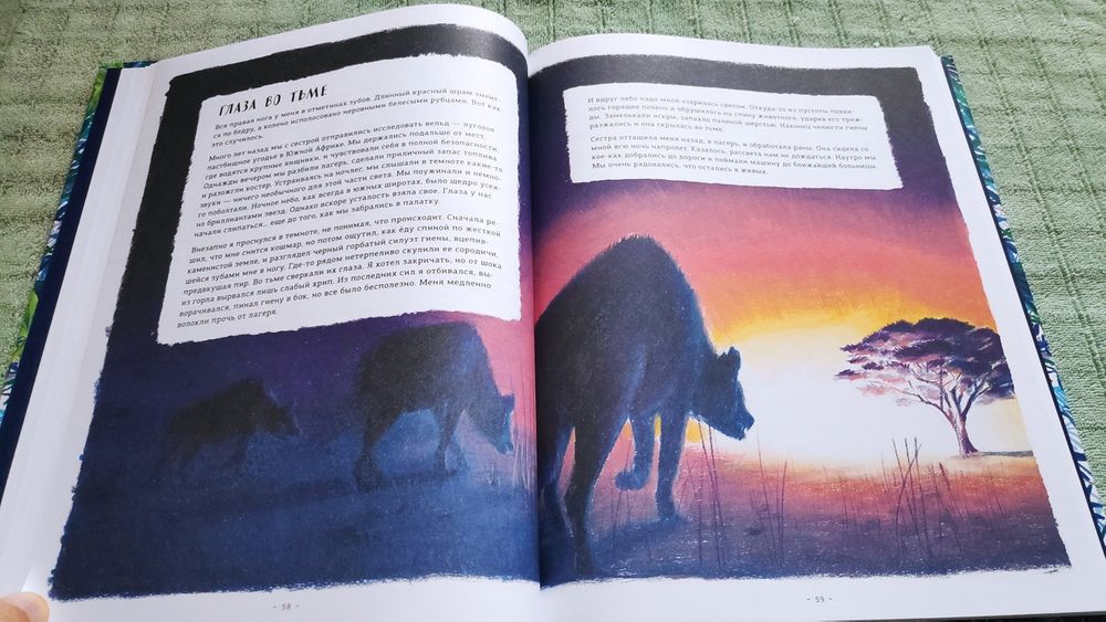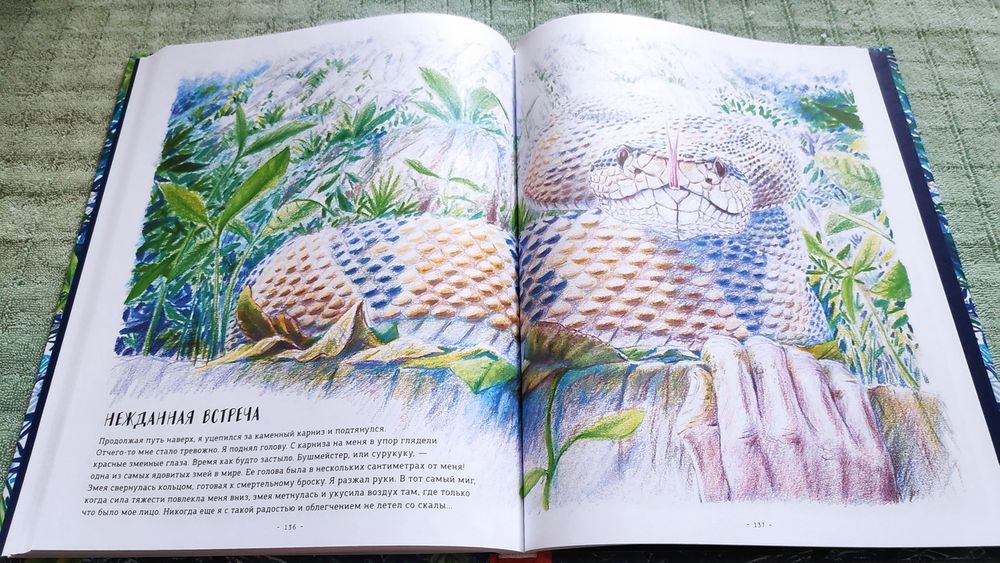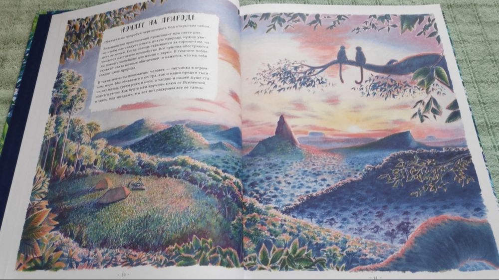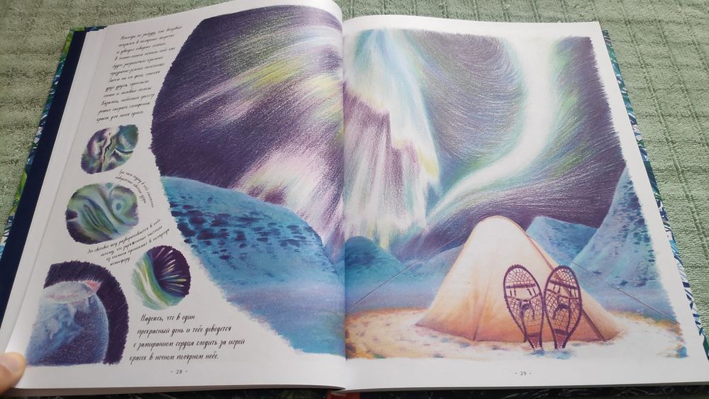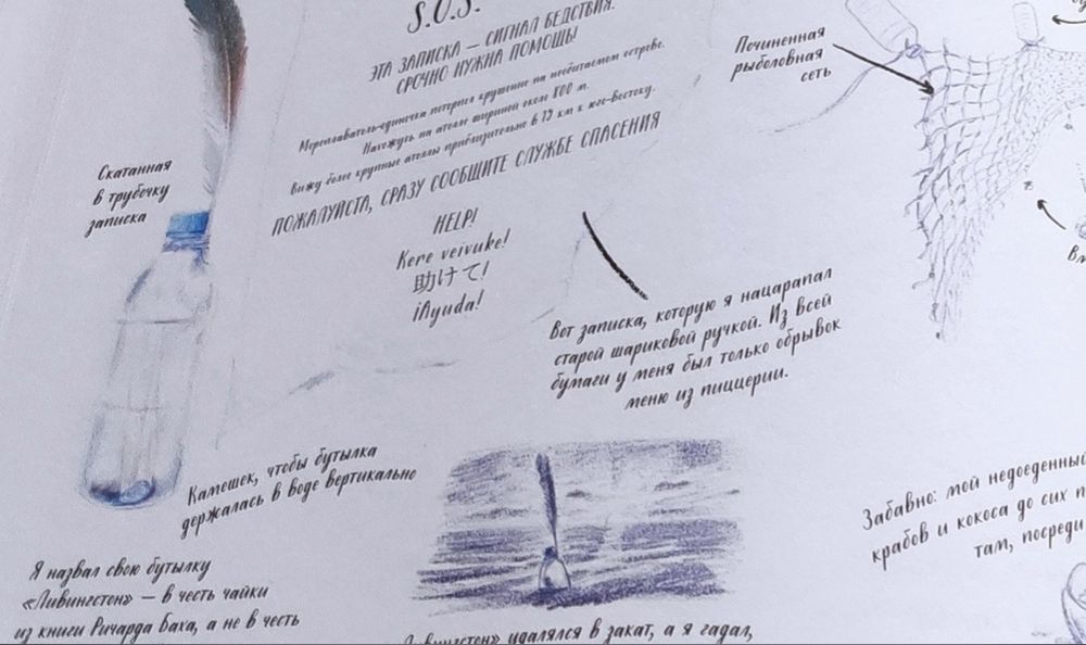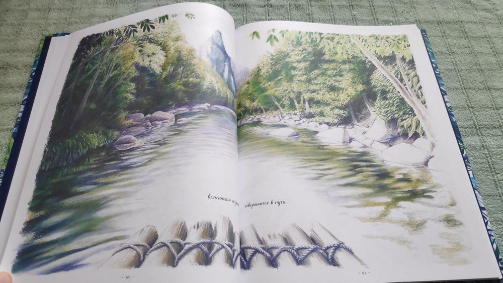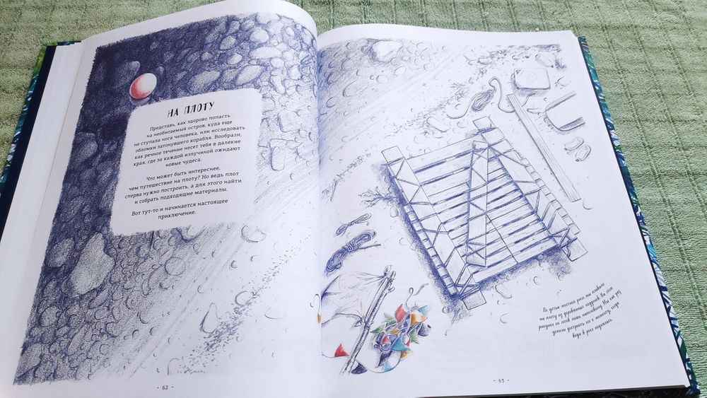 Книга очень красивая! На разворотах множество иллюстраций в такой долгожданной реалистической манере, выполненных в приятной синей цветовой гамме, очень комфортных для восприятия. Часто бывает, что огромное количество рисунков просто свалены в одну кучу и утомляют глаза и мозг, но здесь все продумано, картиночки ведут нас от одной к другой, уточняя и дополняя рассказываемое. Правда места пребывания меняются довольно неожиданно. То тихоокеанский тропический остров, то озеро в лесах Канады, то джунгли, то тундра с оленями, вернее лесотундра.