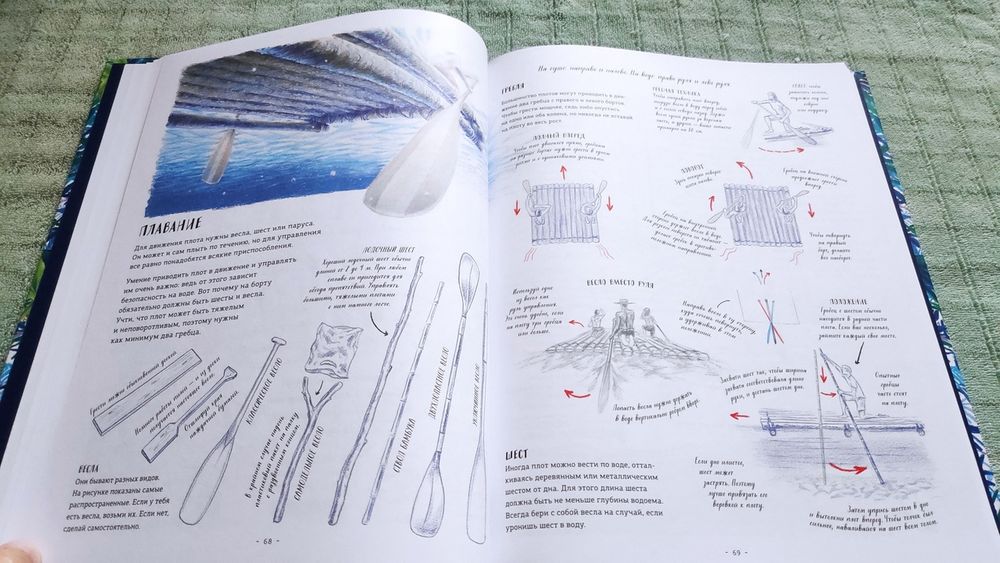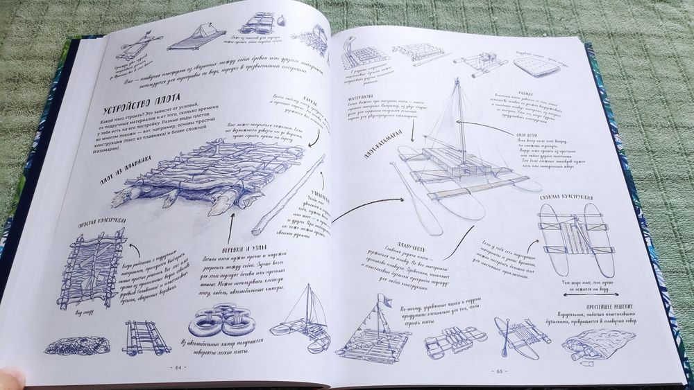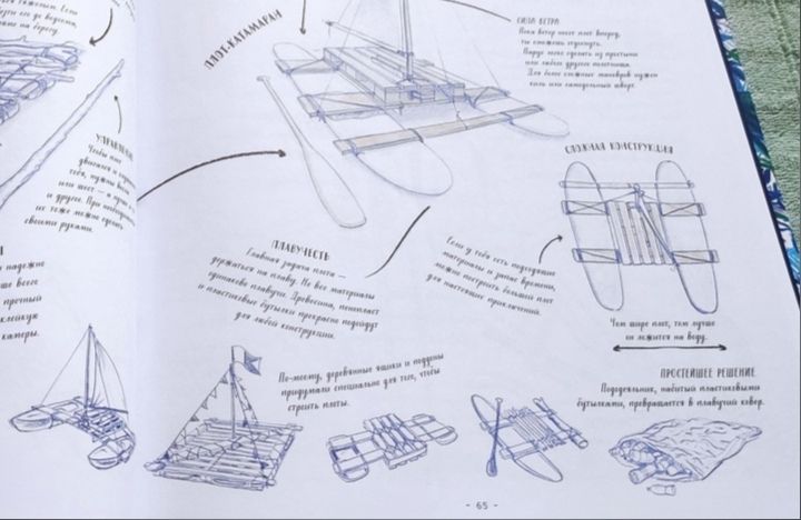 Я надолго зависла на разворотах с конструкциями плотов, так как один из незавершенных детских гештальтов - плавание по какой-нибудь солидной луже на плоту из какой-нибудь калитки (узнаете откуда растут ноги у мечты? Конечно, это гайдаровская "Школа"). Но в местах, где проходило мое детство, не было поблизости водоемов со стоячей водой, лишь мелкие речушки с очень быстрым течением, и тем более не было ни бревен, ни калиток с воротами, и потому практиковали мы только плавания по арыку на автомобильной камере. Стремительно летящий вперед технический прогресс на сегодня предлагает нам для реализации детских мечтаний столько дармового бесплатного материала, что не воспользоваться идеей - просто себя не уважать, расписаться в полной несостоятельности что-то самостоятельно предпринять. Будь у меня сейчас возможность оказаться в летнем детстве на каникулах, я бы немедленно начала строить плот из пластиковых бутылок, чтоб опробовать его на устойчивость хотя бы в дачном надувном бассейне, а для настоящего плавания после бассейновых испытаний у нас под боком тихая протока имеется.
