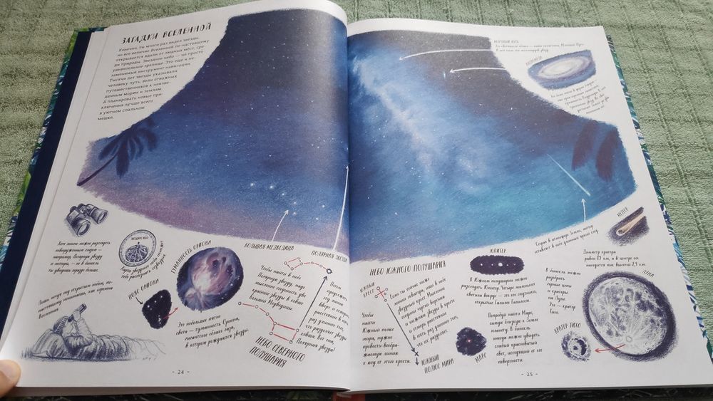И у всей этой красоты, увлекательности и полезности есть только один недостаток. Но довольно существенный для некоторых. Часть текста с пояснениями набрана рукописным шрифтом... Я не знаю чем так привлекают современных книжных дизайнеров эти рукописные трудночитаемые шрифты, кто им наврал, что с ними книга будет выглядеть интересней, а значит и читаться лучше, но шрифт чтение все же затрудняет.