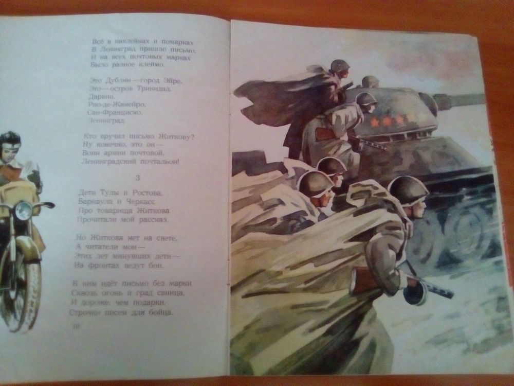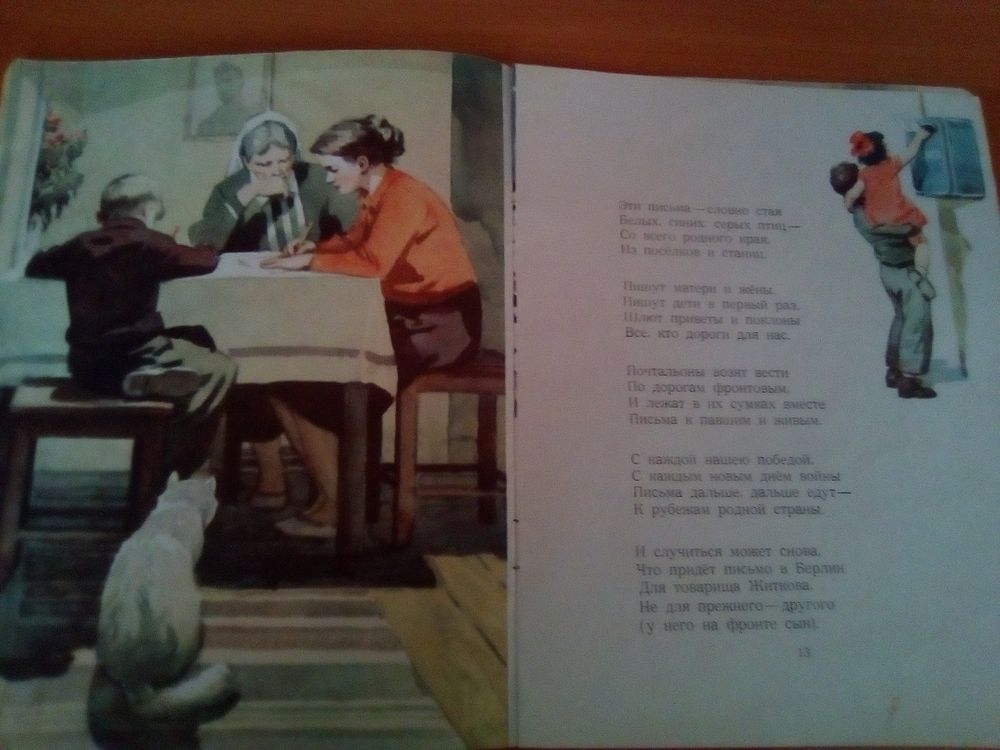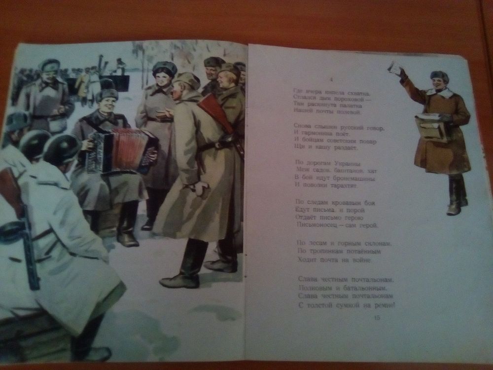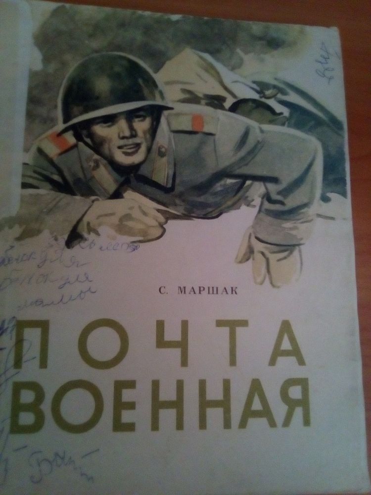 С.Я Маршак "Почта военная". Не знаю, откуда у нас появилась эта книжка, но помню, что любила её рассматривать (да и обложка, видимо, от моих рук пострадала). А еще в начале книги есть дарственная надпись, удивительно, что в 71 году она сделана чернилами, я думала, что в то время уже все шариковыми ручками писали:
