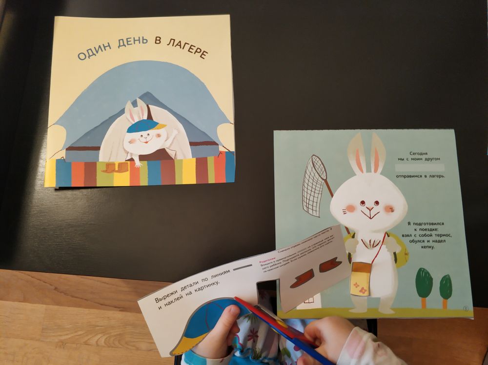 В конце 11-страничный проект - ребенок мастерит книжку с картинками про поход, вырезая детали и делая аппликации, главный герой книжки общается с ребенком, обращаясь по имени (нужно вписать).