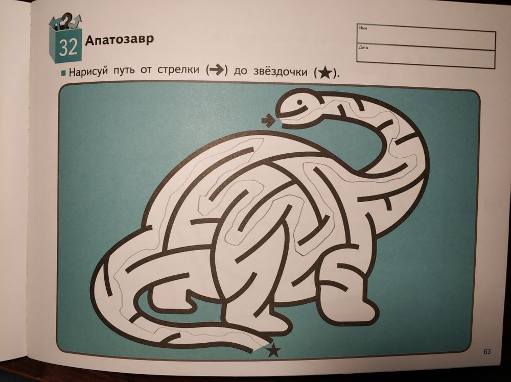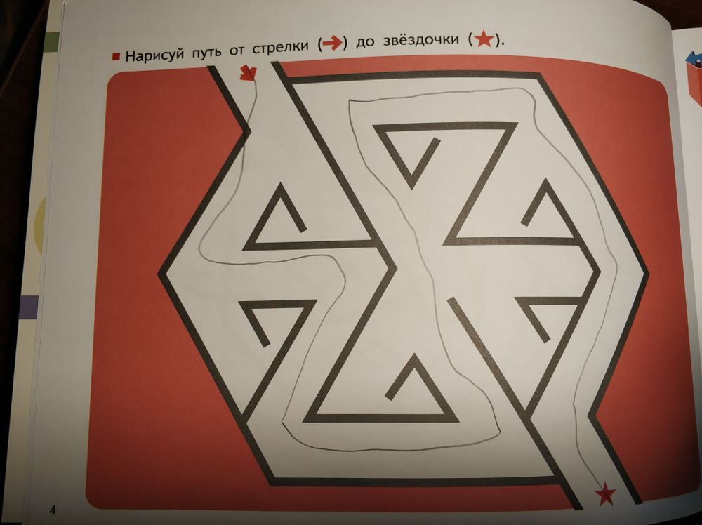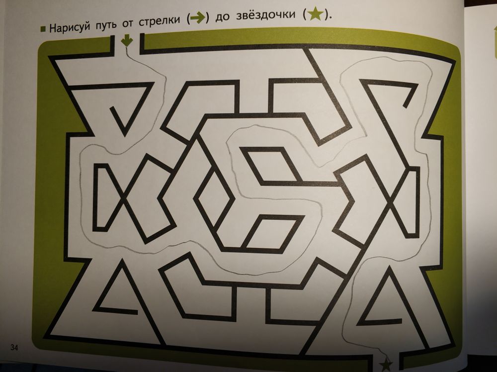 Kumon "Лабиринты" из серии "Учимся и растем" - задания несколько проще "Увлекательных лабиринтов" (пошли не по рекомендуемой карте Kumon), зато сами лабиринты Уже. Просила дочку проходить неспеша, не прикасаясь к стенкам, тренировали аккуратность в прохождении. Для этих целей пособие подошло идеально.