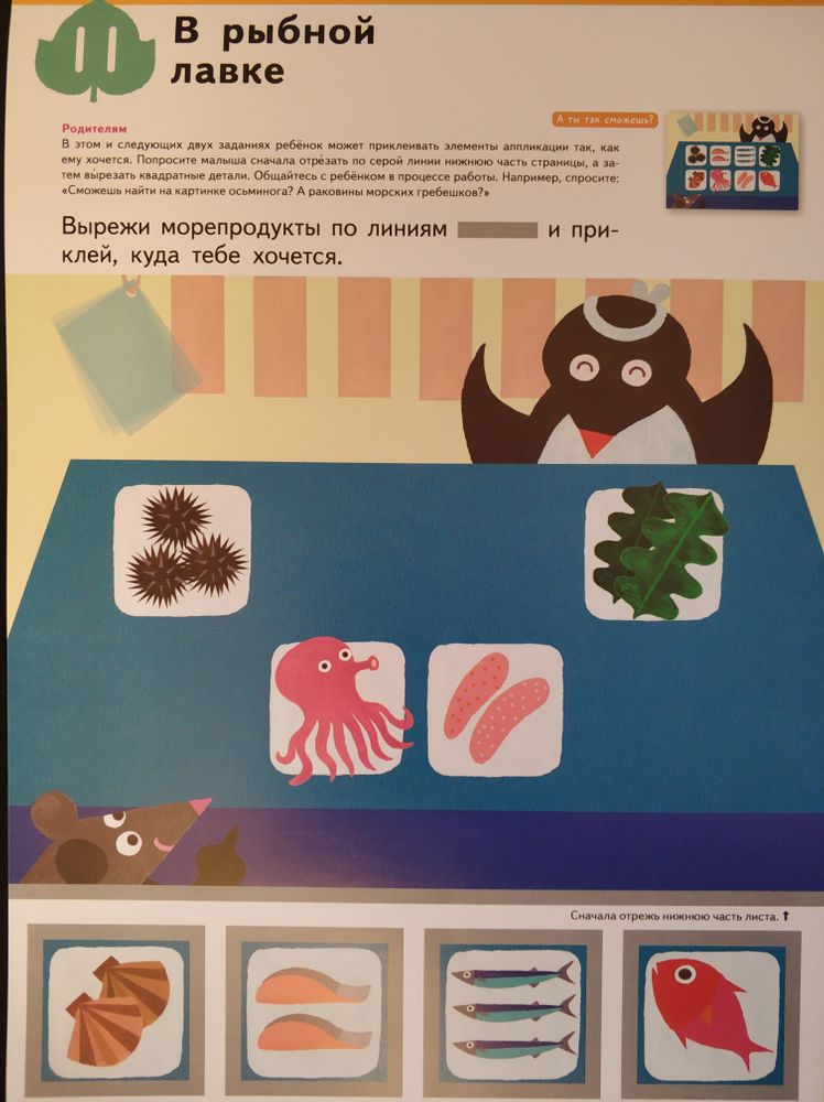 Kumon "Уроки аппликации" - дошли примерно до середины, и это восторг, очень классные картинки, интересные сюжеты. Покажу начало и середину: