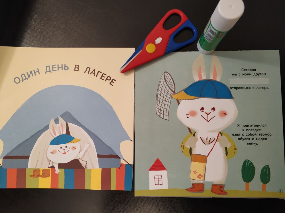 Идея с книжкой, которую делает сам ребенок, просто гениальна! Вырезание мелких предметов для книжки, например, ботиночек у зайца, вызвало трудности, пришлось помогать.