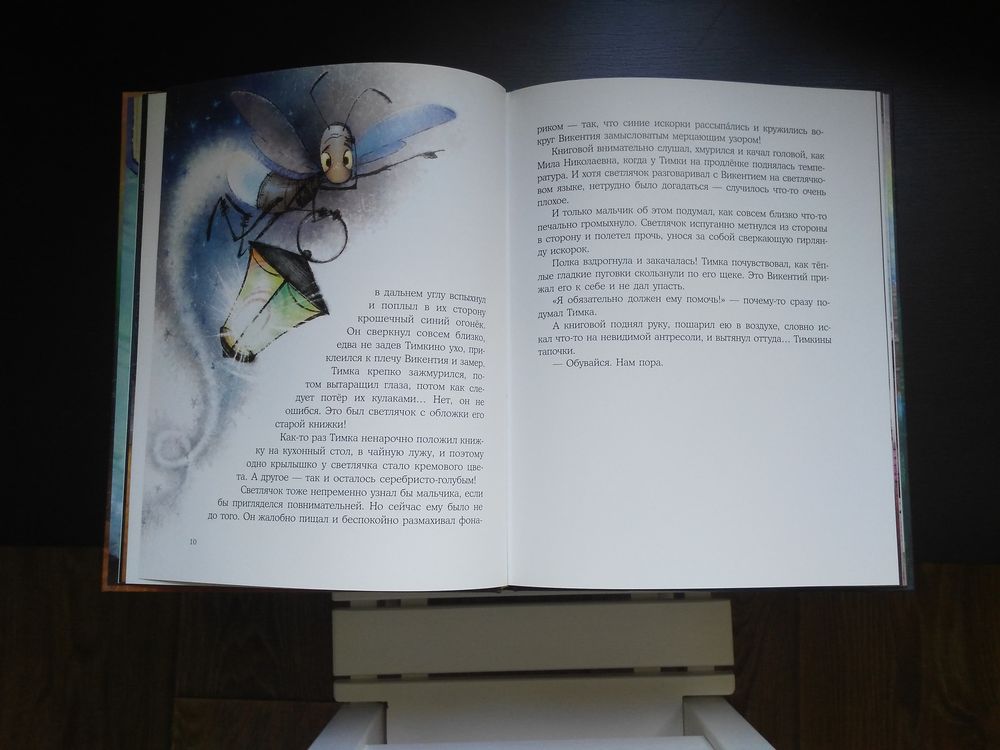 Книгу с светлячком Тимофей однажды положил на стол, где был разлит чай и с тех пор у него одно крылышко бежевое. Именно таким он его и встретил в своем приключении - перепачканным:
