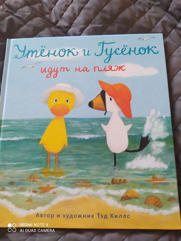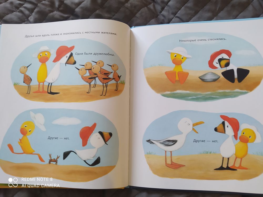 Содержание чем то напомнило мне Чик и Брики. Два друга - утенок и гусенок. Один похрабрее, предлагает отправится в путешествие на пляж. Другой опасается, но соглашается. В середине книги, правда, они поменялись ролями. Более храбрый стал нерешительным, и наоборот. Я не поняла почему, а девчонки не обратили внимание на это.