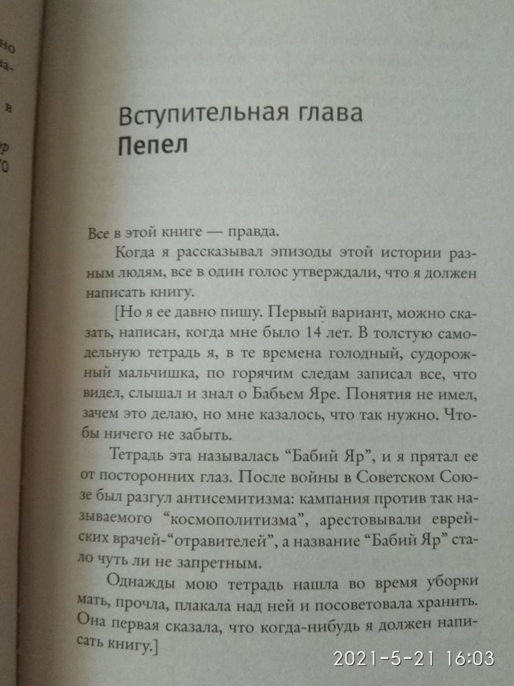 Эта книга пронизана честностью, так что и писать про нее мне тоже хочется честно. Узнала я про нее здесь в ДК от Оли из Тулы, она написала потрясающий отзыв (как собственно и все ее отзывы) про эту книгу. И тогда я захотела ее купить и прочитать. В продаже есть две книги Бабий яр: от Речи и от АСТ. Как я понимаю, от Речи вышла урезанная, отредактированная и отцензуренная версия. А АСТ выпустил авторскую версию. Купила я книгу полную. Но напишу честно, что купила из-за цены. На нее появилась скидка и я быстрей хватать.