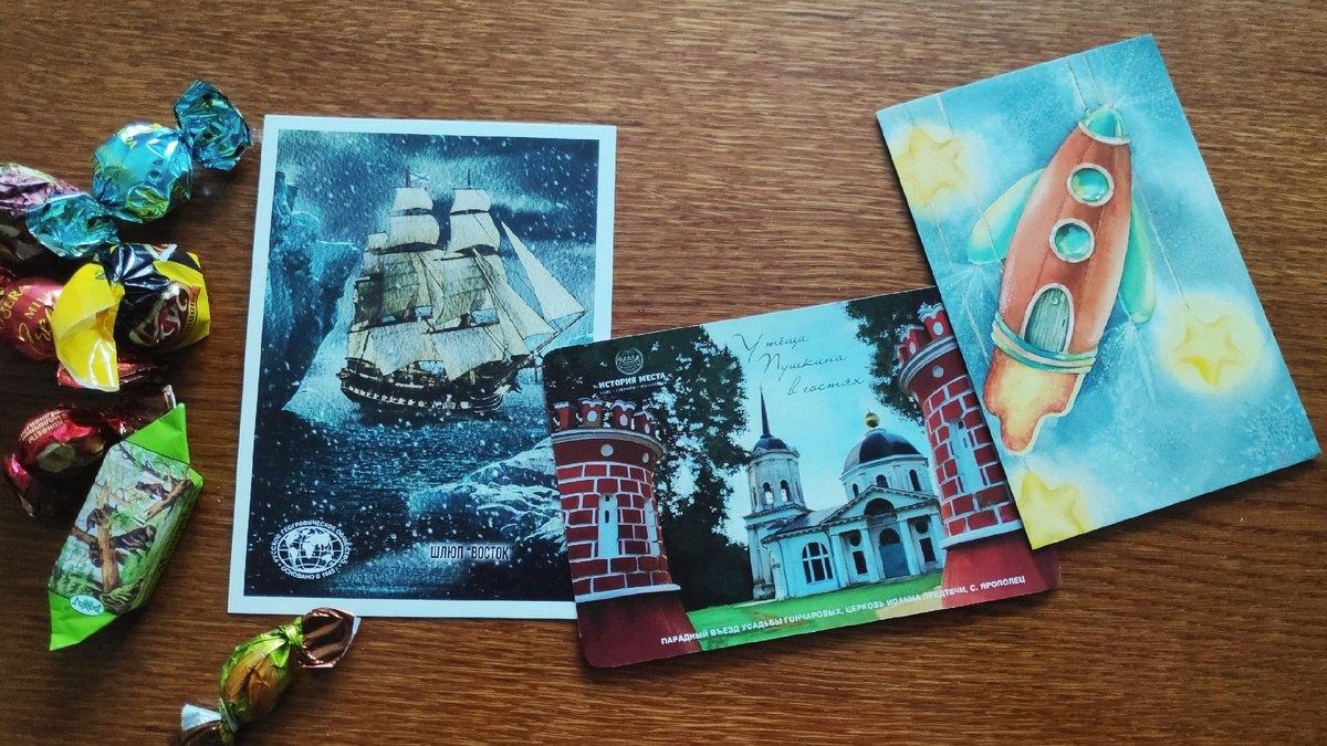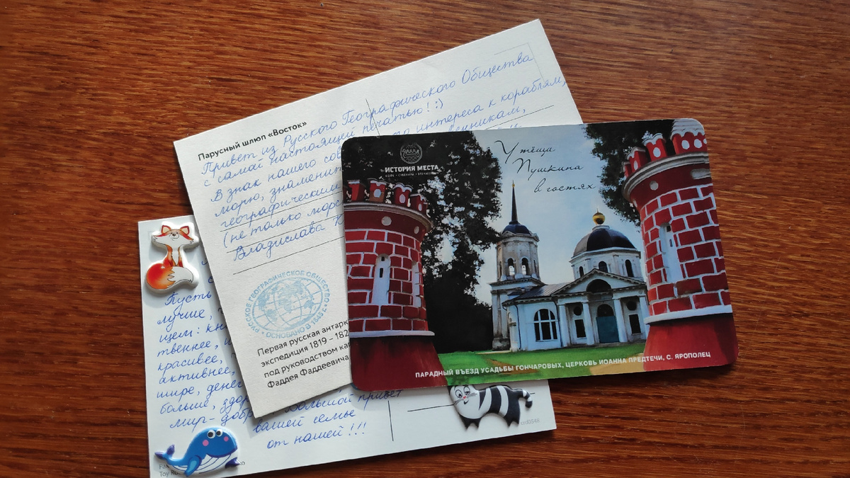 Каждая из открыток - веха, отмечающая разные события и общие интересы - вот открытка из имения тещи Пушкина Ярополец, а вот парусник - шлюп "Восток" капитана Беллинсгаузена.