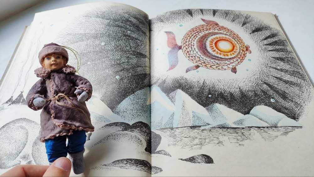Снег уже растаял, дочка сфотографировала Ванечку на фоне снежных разворотов сказки про Умку с рыбой-солнцем