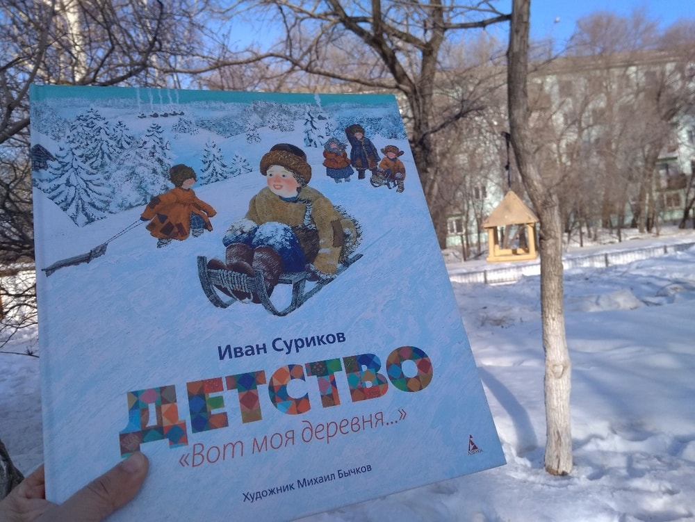 Все сразу назвали его Филипком. Возможно, у меня тоже возникла бы именно эта ассоциация с книжным героем, но Филипок шел в школу в большой отцовской шапке, а этот мальчик сразу стал для меня Ванечкой, Ванькой, маленьким Ваней Суриковым, чье детство прошло в деревне и описано в стихотворных строках "Вот моя деревня, вот мой дом родной, вот качусь я в санках по горе крутой". Моя большая красивая книга "Детство" с иллюстрациями Михаила Бычкова так нравилась детям, которым я ее читала! Ее лоскутные яркие форзацы, подробно отрисованные развороты оживляли стихотворение, написанное еще в позапрошлом веке!
