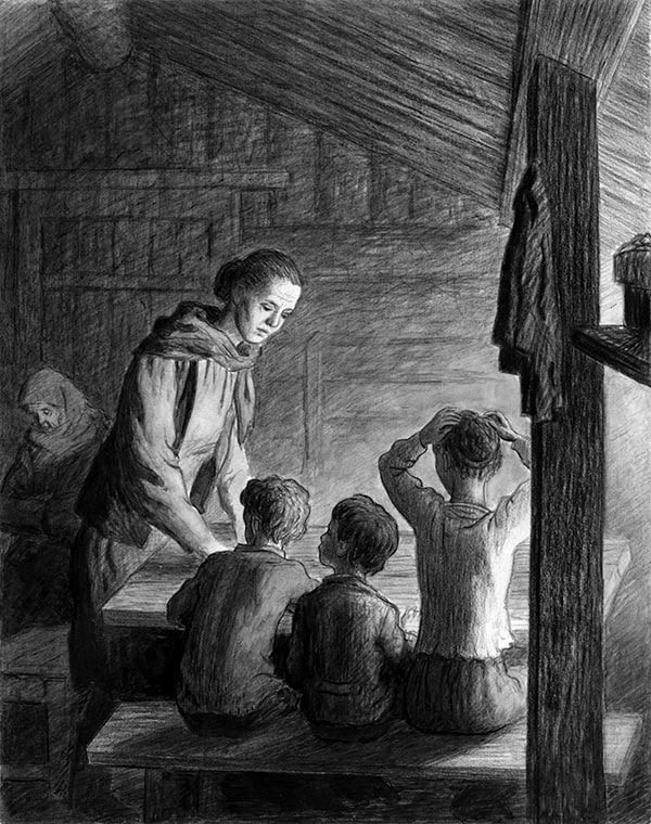 В землянке живёт семья - их дом заняли немцы, людей просто выкинули на улицу. Родители и четверо детей. Но старшего сына Валентина нет - его забрала накануне комендатура. Немцы отправили парня тащить обоз - людей использовали как тягловую силу. Утром же староста с немцем забирают отца. Куда? "На работу".