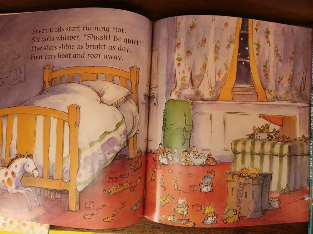 Одна из любимых книг Дональдсон, иллюстрации очень детские, только у нас картонка, иллюстрации теже