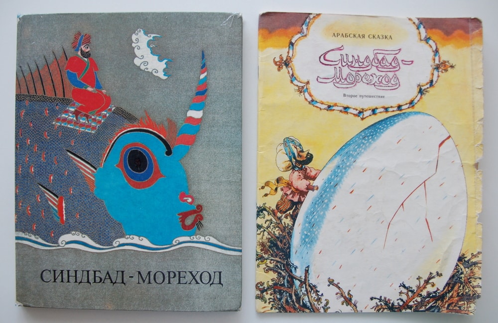 Сказки про Синдбада-морехода: в толстой книге с иллюстрациями Михаила Майофиса 6 историй, и в тонкой желтенькой книге с иллюстрациями Бориса Аникина – второе путешествие отдельно.