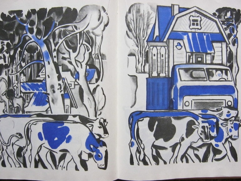 И вот эта иллюстрация тоже возвращает меня в летние деревенские вечера, когда надо было идти встречать нашу корову - приметную Белку с рыжими крапинками на белых боках и красивыми глазами в черных ресницах. (А.Кардашова - От дома до неба)