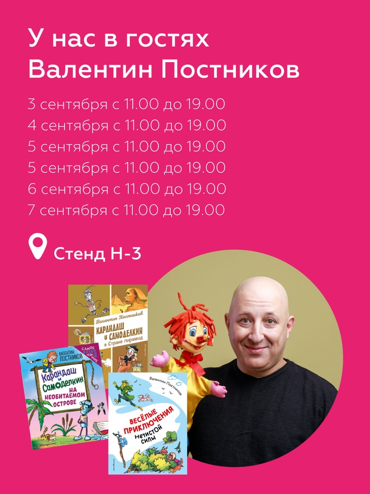 • Стенд Н-3. Ежедневно Валентин Постников, автор знаменитых историй о «Карандаше и Самоделкине», готов пообщаться с юными читателями и подарить море улыбок.