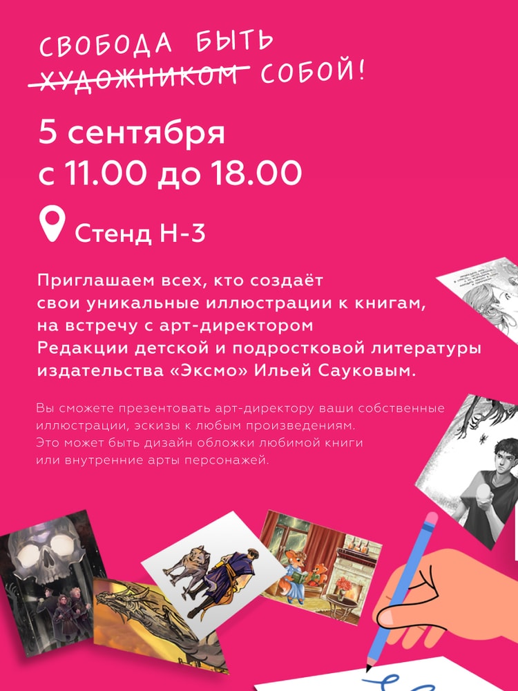 • Стенд Н-3. 5 сентября можно принести свои иллюстрации арт-директору издательства «Эксмодетство» Илье Саукову, и возможно договориться о дальнейшем сотрудничестве.