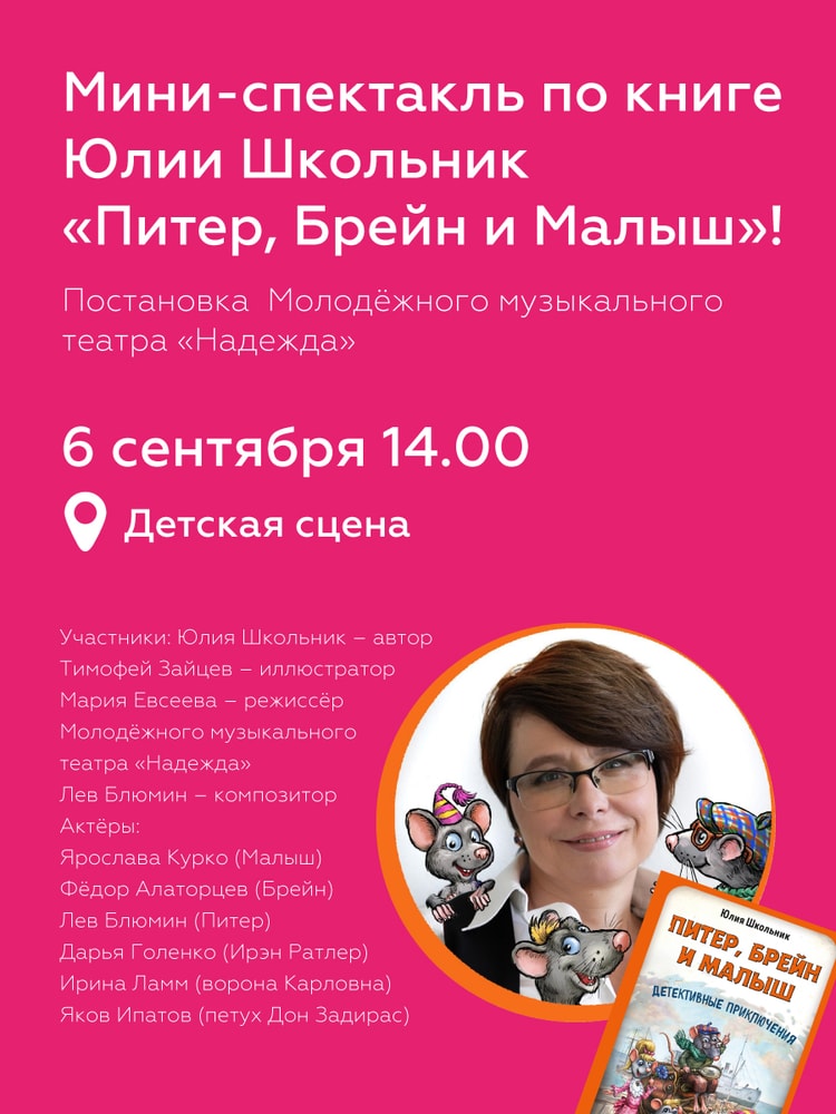 — 14:00, детская сцена. Мини-спектакль-мюзикл по книге Юлии Школьник «Питер, Брейн и Малыш». Яркая постановка от Молодежного музыкального театра «Надежда»! Добрая, веселая и увлекательная история о настоящей дружбе и взаимопомощи. Герои книги оживут на сцене: Питер, Брейн, Малыш, Ирэн Ратлер, ворона Карловна, Дон Хорхе и кот по имени Кот. Участники спектакля: Юлия Школьник, Тимофей Зайцев, режиссер Мария Евсеева, композитор и актер Лев Блюмин, а также талантливые артисты театра.