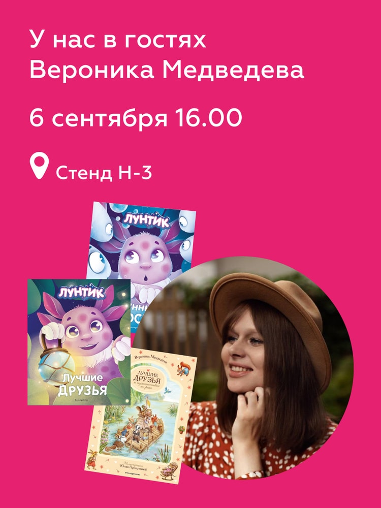 — 16:00, стенд H-3. Встреча с Вероникой Медведевой — автором, который знает, как тронуть сердце и ребенка, и взрослого.