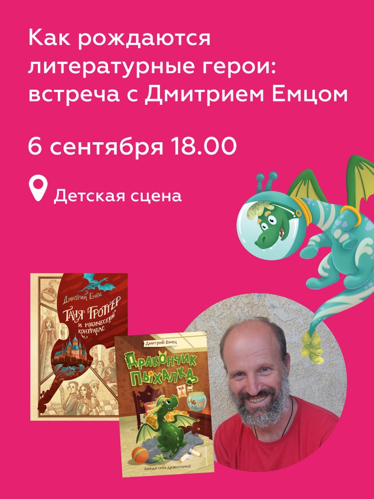 — 18:00, детская сцена. Большая встреча с Дмитрием Емцом — легендой детской и подростковой фантастики! Автор бестселлеров «Таня Гроттер», «Мефодий Буслаев» и «ШНыр» расскажет о том, как рождаются герои, в которых влюбляются целые поколения, где черпать вдохновение для масштабных вселенных и почему именно его книги стали для многих проводником в мир чтения.