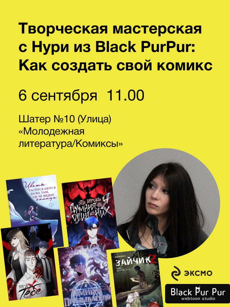 — 11.00 Шатер №10 (молодежная литература/комиксы). Творческая мастерская с Нури из Black PurPur: Как создать свой комикс. На мероприятии вы узнаете, как рисовать мангу, создавать персонажей и работать с крупными издательствами.