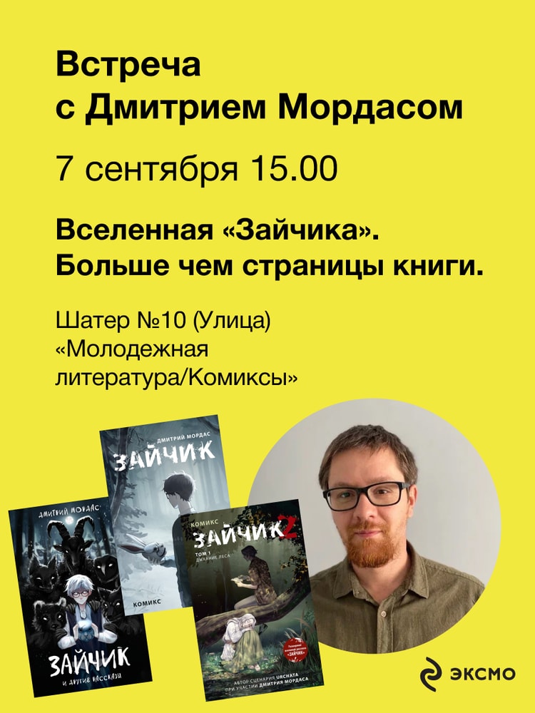 • 7 сентября, 15:00. Шатер №10 (молодежная литература/комиксы). Погружение в хоррор-вселенную с Дмитрием Мордасом — автором культового «Зайчика». Вместе с автором обсудим, как истории выходят за границы страниц и становятся частью поп-культуры.