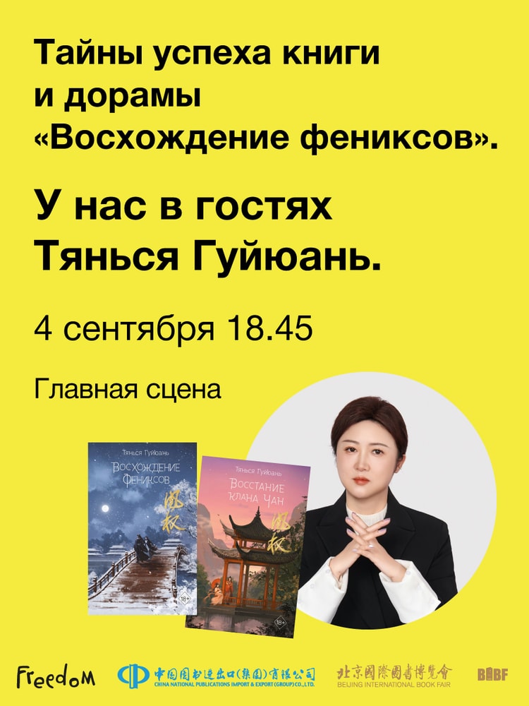 • 4 сентября в 18:45 на главной сцене выставки китайская писательница Тянься Гуйюань проведет презентацию серии книг «Восхождение фениксов», расскажет о нюансах написания этой истории и ответит на вопросы читателей.