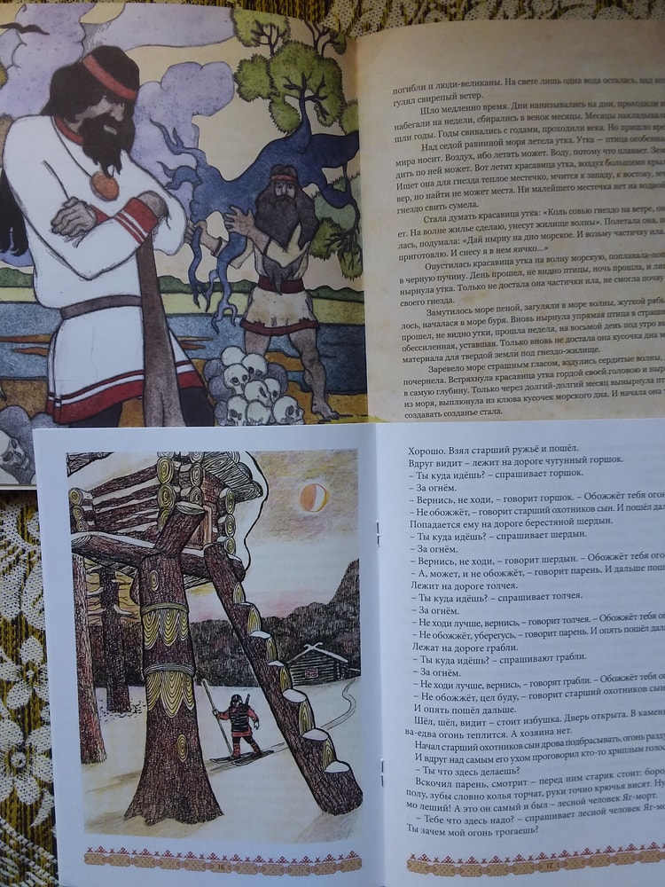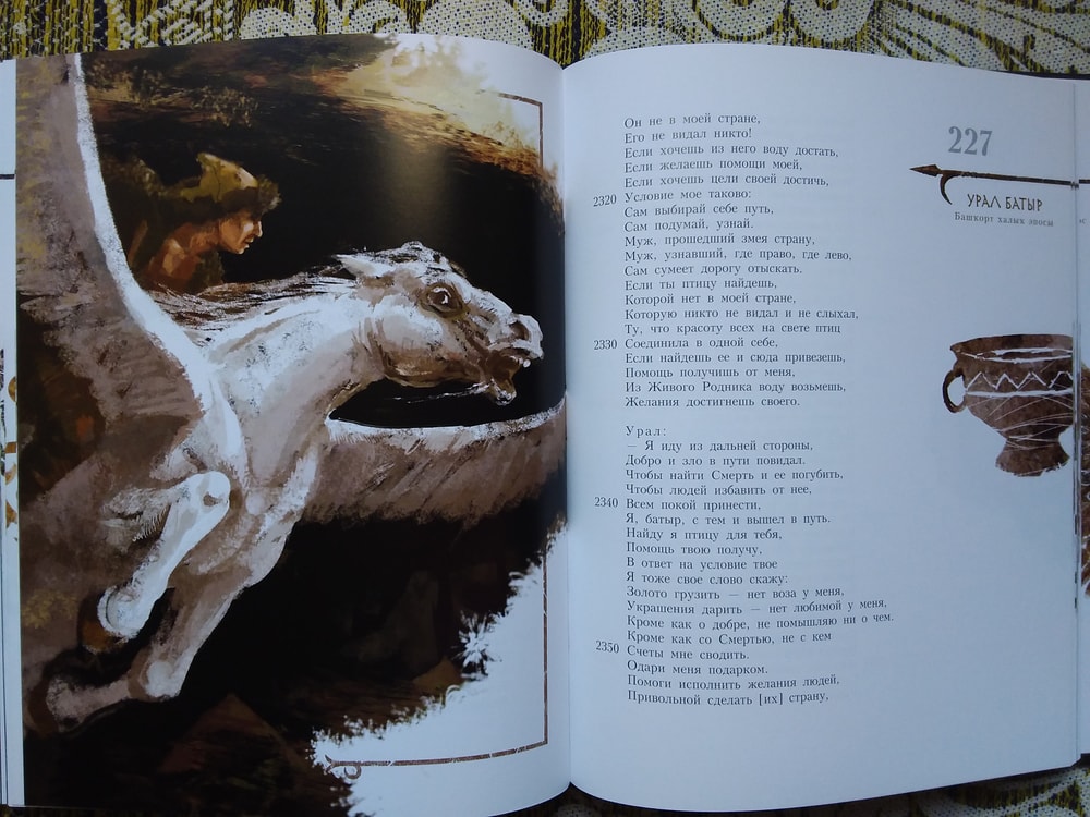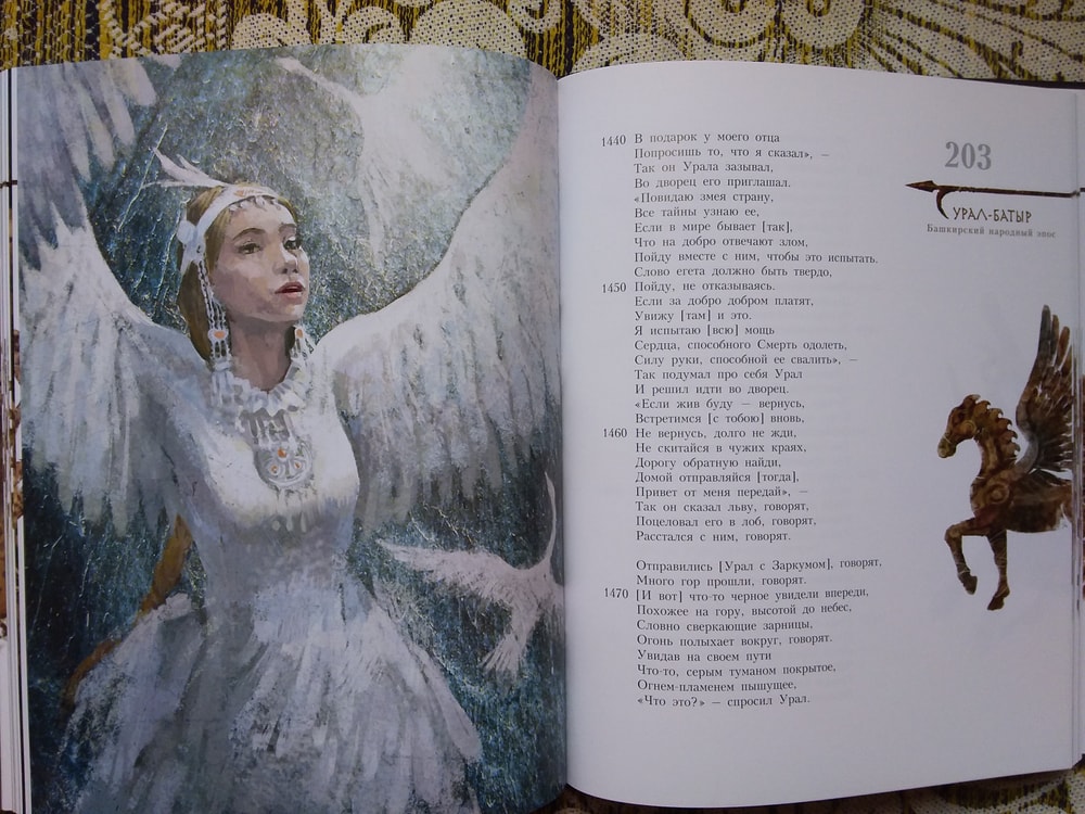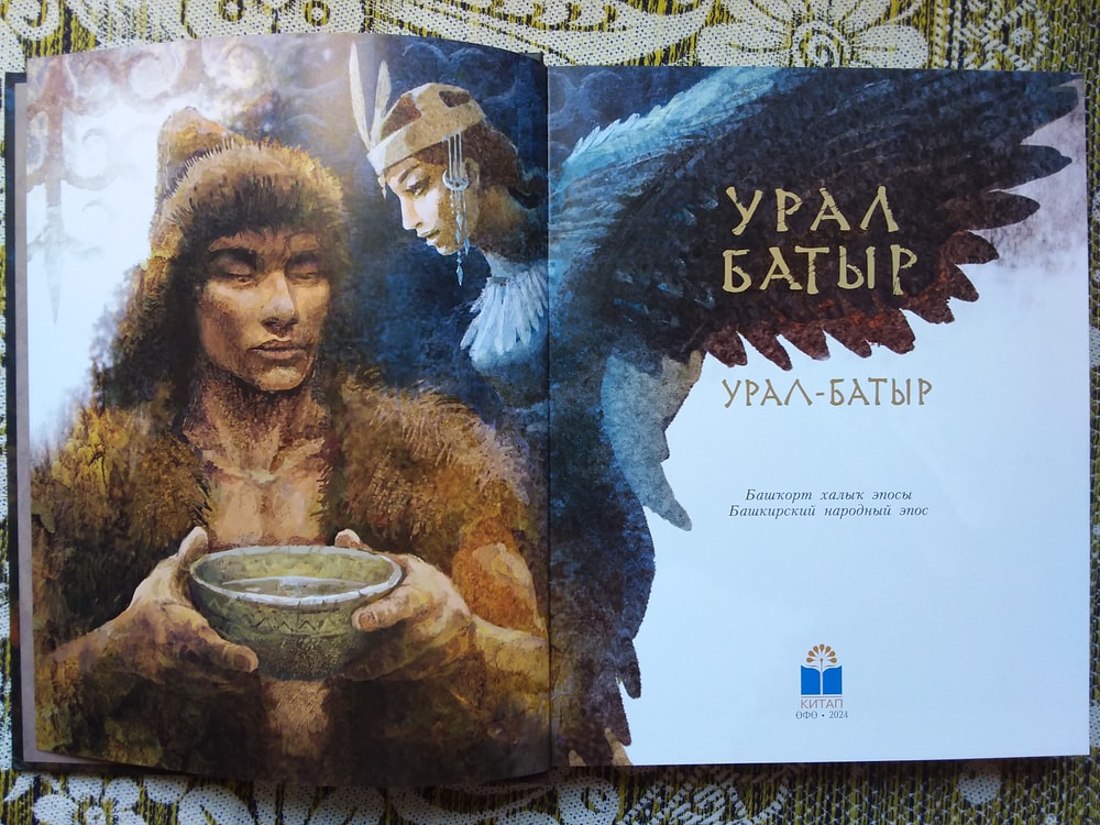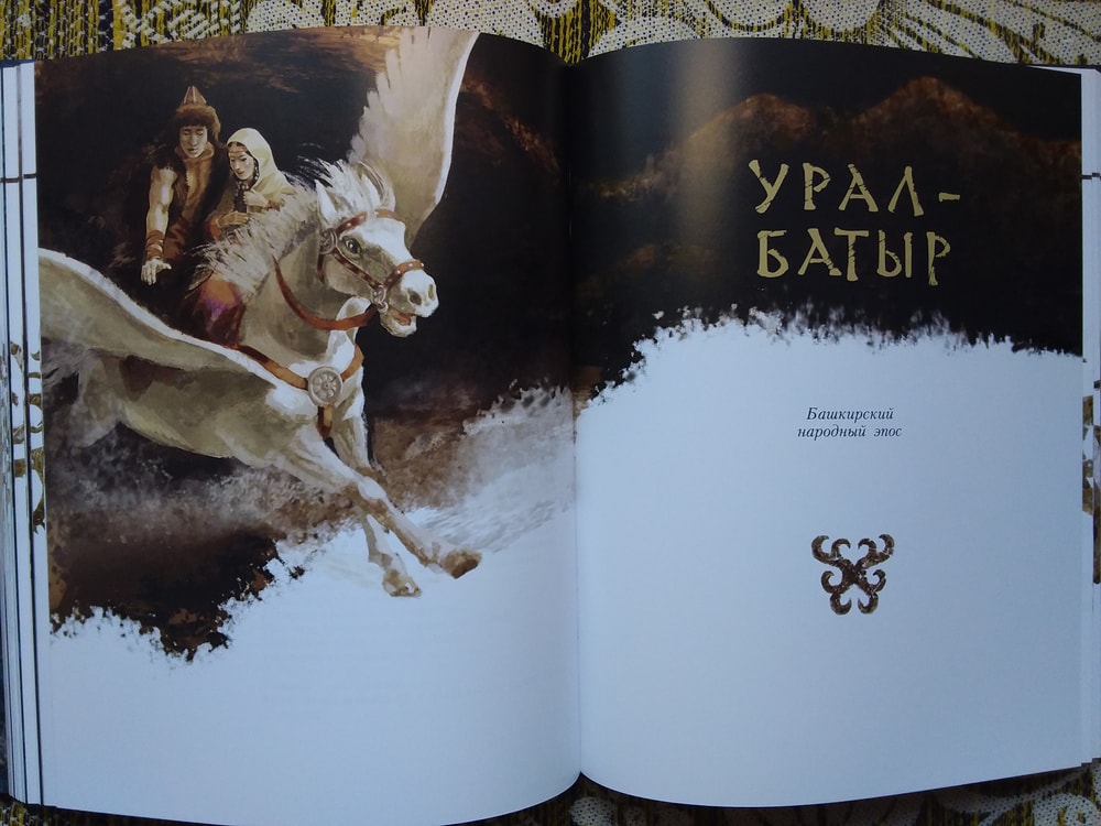Книга на двух языках, 150 страниц на башкирском и почти столько же на русском. Иллюстрации, по моим ощущениям, не привязаны к тексту, не читала ещё. Но мимо пройти не смогла ). Книжка очень красивая, да и наш папа из Башкирии ).