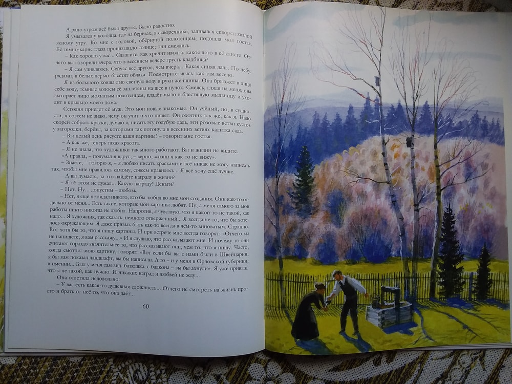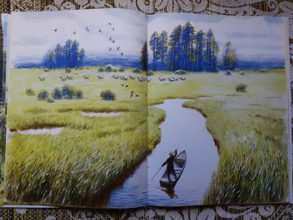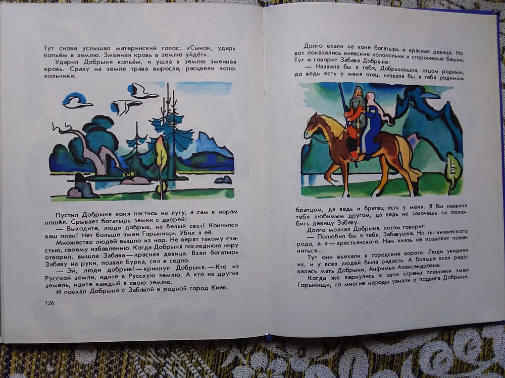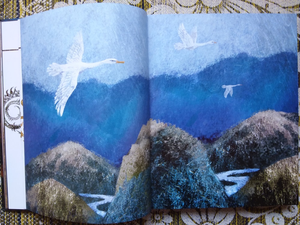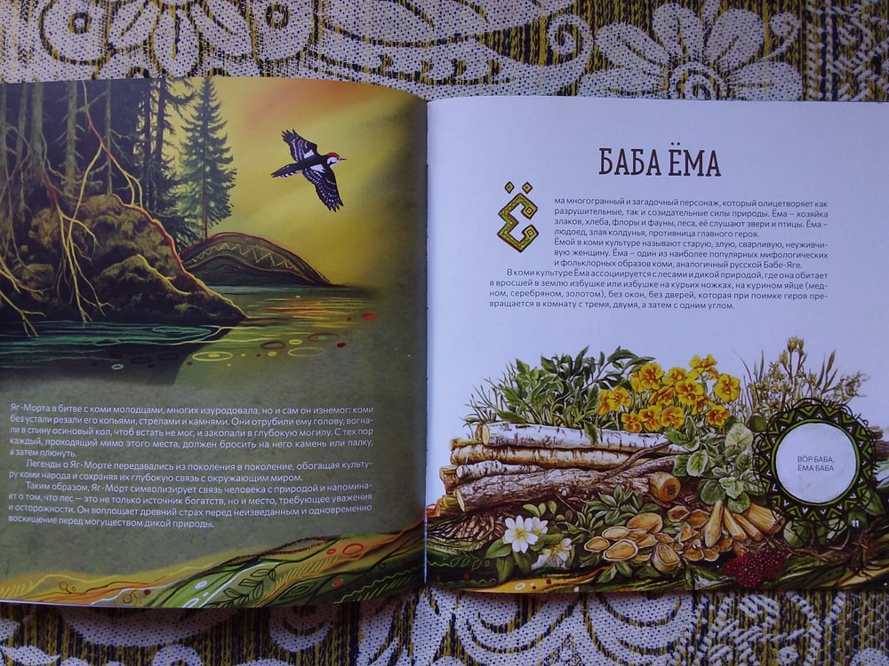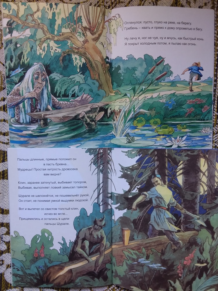 Книга на двух языках, 150 страниц на башкирском и почти столько же на русском. Иллюстрации, по моим ощущениям, не привязаны к тексту, не читала ещё. Но мимо пройти не смогла ). Книжка очень красивая, да и наш папа из Башкирии ).