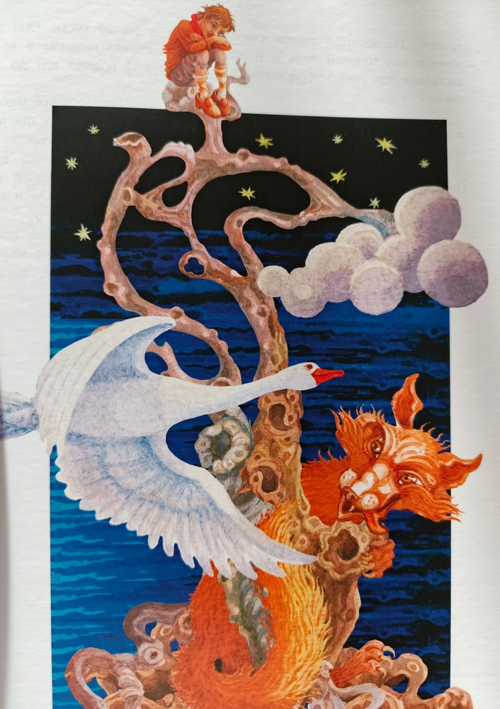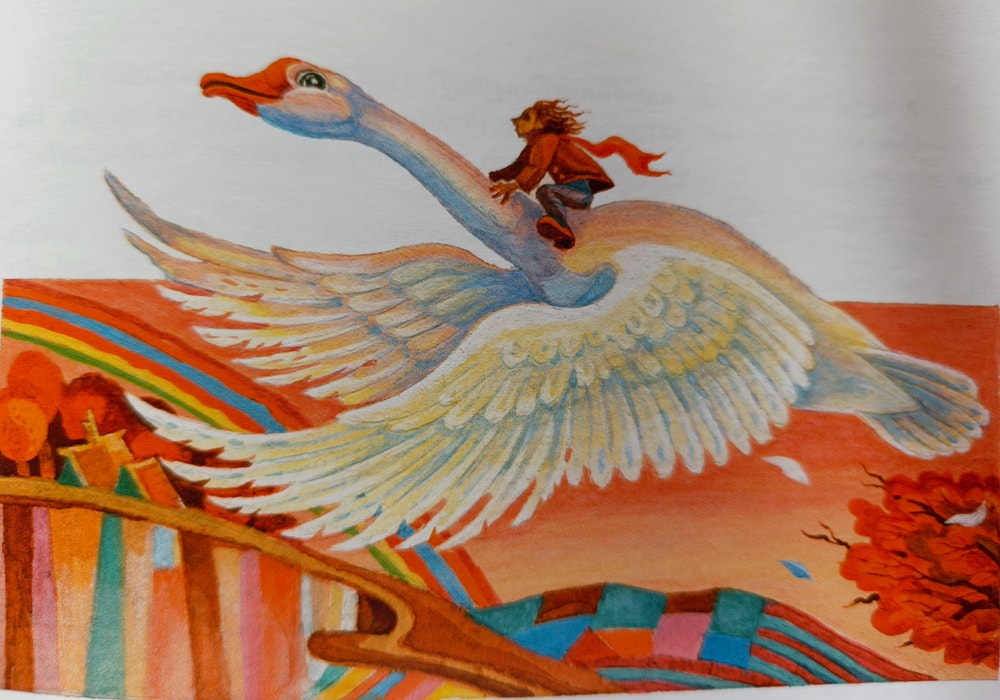 Гусь Мартин носит на себе Нильса